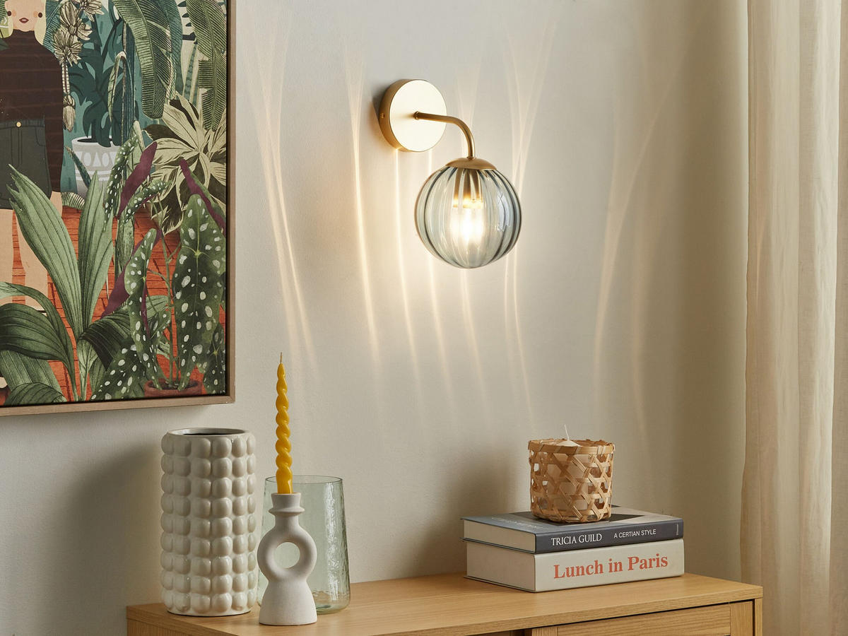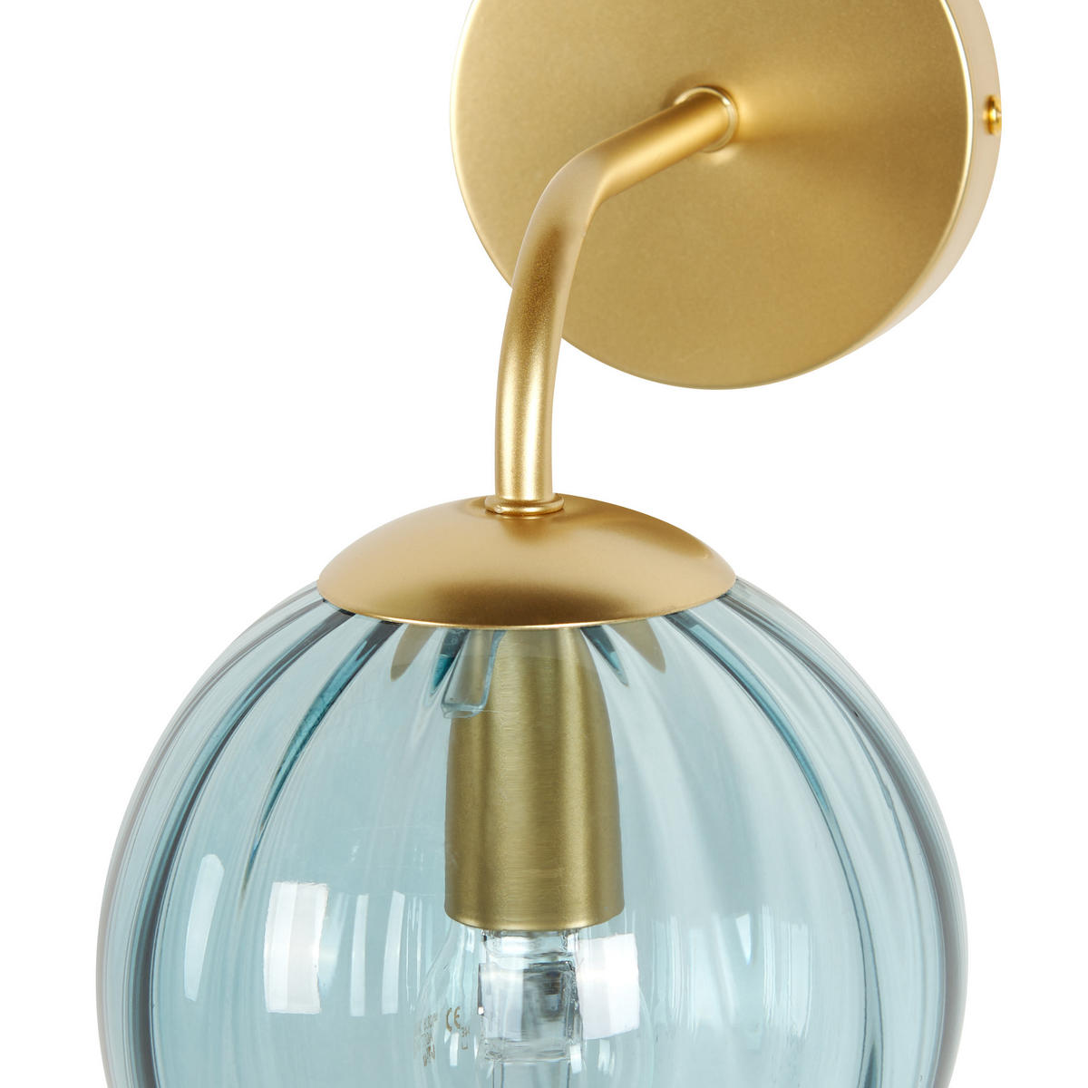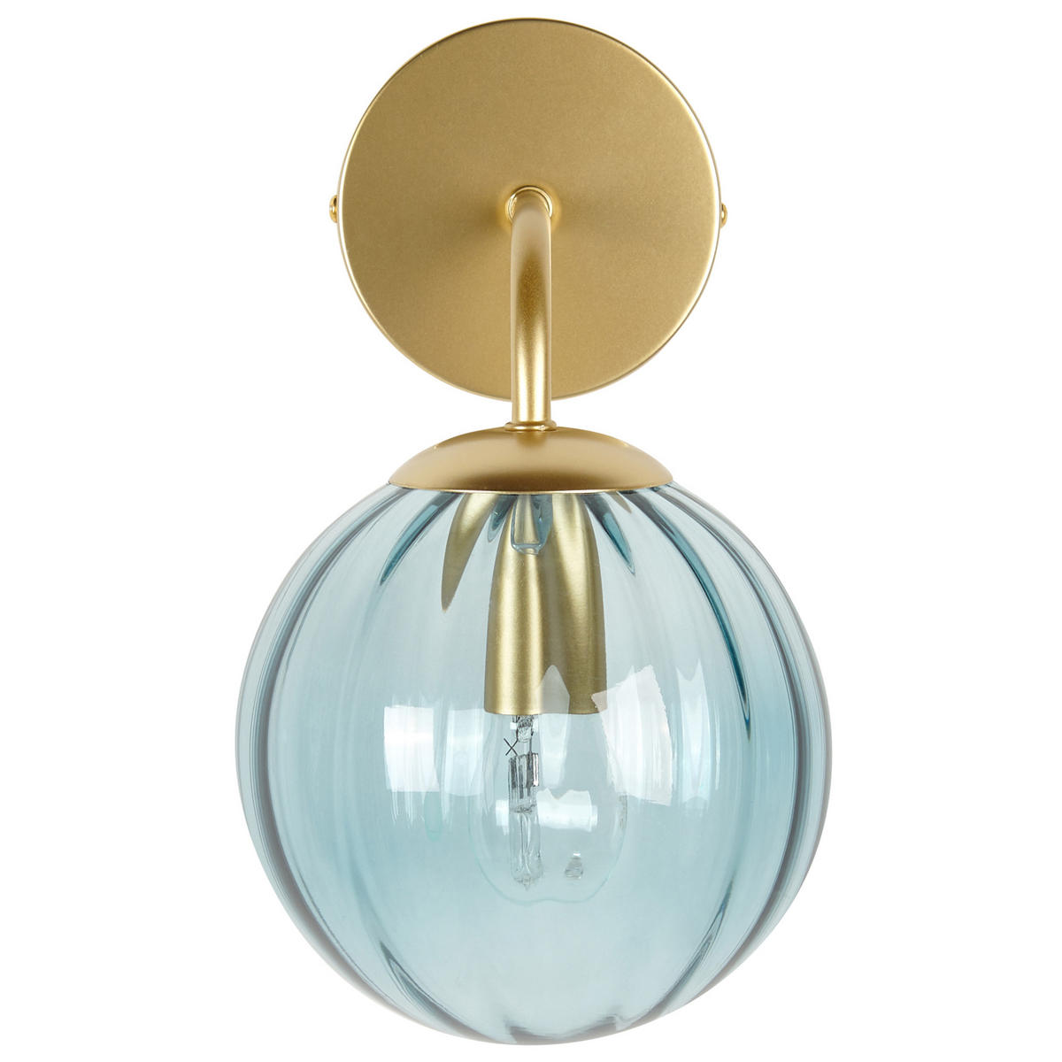 Золотистый металлический настенный светильник с абажуром из синего стекла в ретро-стиле. Оживите и украсьте свой дом этим светильником в стиле ар-деко. Сферический абажур из цветного стекла впечатляет не только стойкостью цвета, но и уникальной рифленой структурой. Эти две особенности придают светильнику особую декоративность. Благодаря привлекательному дизайну и блестящей золотистой поверхности металлического рожка он станет настоящей изюминкой вашего интерьера.