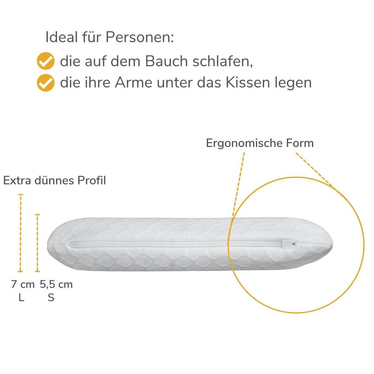 Сверхплоская подушка Inphysio специально разработана для тех, кто спит на животе, и тех, кто предпочитает особенно тонкую подушку. Подушка средней плотности высотой всего 5,5 см и размером 50 x 30 x 5,5 см обеспечивает поддерживающую поддержку для спокойного сна.
