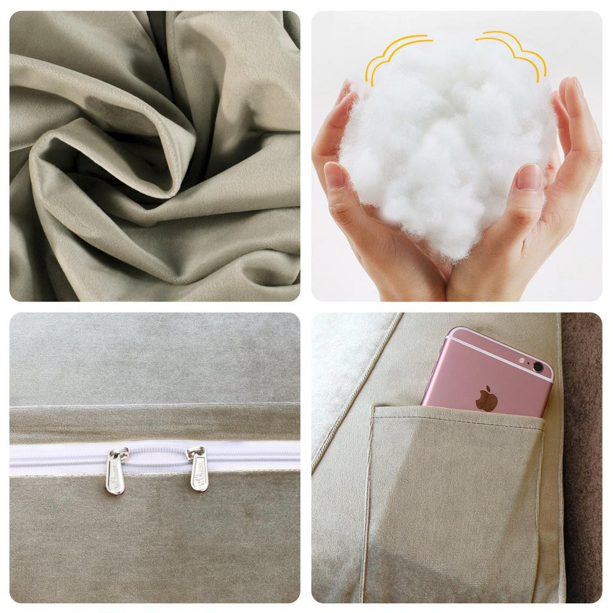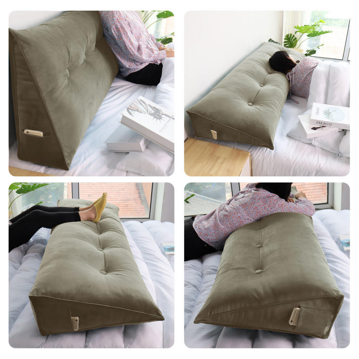 Эта большая треугольная подушка для спины обеспечивает удобную и стабильную поддержку спины для двух или более человек одновременно, что делает ее идеальным вариантом для вас и вашей семьи, чтобы читать или смотреть телевизор, сидя в постели. Независимо от того, как вы наклоняетесь на эту подушку для чтения, она не сдвинется и не сломается так легко, как обычная подушка. Как подушка для изголовья, она не требует установки и проста в использовании, закрывая зазор между изголовьем и матрасом. Небольшие карманы по обеим сторонам клиновидной подушки легко вмещают небольшие повседневные предметы, такие как мобильные телефоны, пульты дистанционного управления, очки и ручки. Подушки для кровати доступны в 9 стандартных размерах, чтобы соответствовать различным требованиям к ширине кровати. С одной из подушек длиной 200 см диван-кровать / односпальная кровать можно легко превратить в диван / кушетку. Эту подушку часто используют в качестве подушки для общежития, глубокой спинки дивана, подушки для прицепа на колесах, подушки для ограждения детской кроватки и т. д. Она также может помочь облегчить такие проблемы, как изжога и послеоперационная боль в спине. Еще больше возможностей для использования ждут своего открытия.