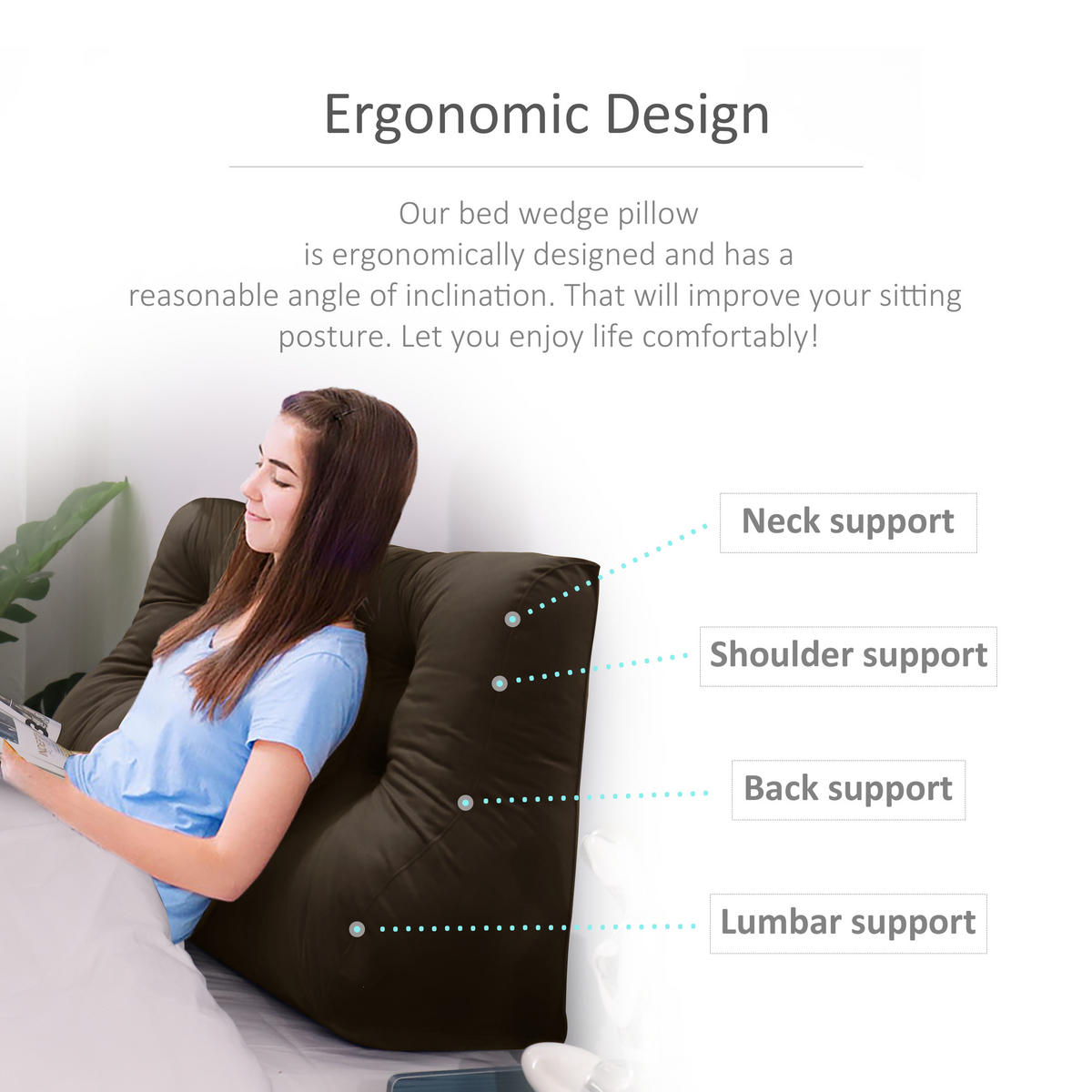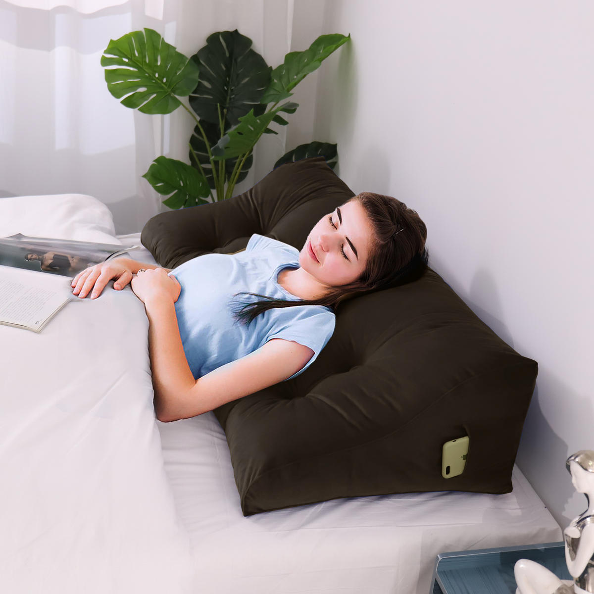 Эта большая контурная треугольная подушка для спины обеспечивает удобную и стабильную поддержку спины для двух или более человек одновременно, что делает ее идеальной для вас и вашей семьи, чтобы читать или смотреть телевизор, сидя в постели. Независимо от того, как вы наклоняетесь на эту подушку для чтения, она не сдвинется и не сломается так легко, как обычная подушка. Как подушка для изголовья, она не требует установки и проста в использовании, закрывая зазор между изголовьем и матрасом. Небольшие карманы по обеим сторонам клиновидной подушки легко хранят мелкие повседневные предметы, такие как мобильные телефоны, пульты дистанционного управления, очки и ручки. Подушки для кровати доступны в 9 стандартных размерах, чтобы соответствовать различным требованиям к ширине кровати. С одной из подушек длиной 200 см диван-кровать / односпальная кровать можно легко превратить в диван / кушетку. Эту подушку часто используют как подушку для общежития, глубокую спинку дивана, подушку для кемпера и т. д. Она также может помочь облегчить такие проблемы, как изжога и послеоперационная боль в спине. Еще больше возможностей для использования ждут своего открытия.