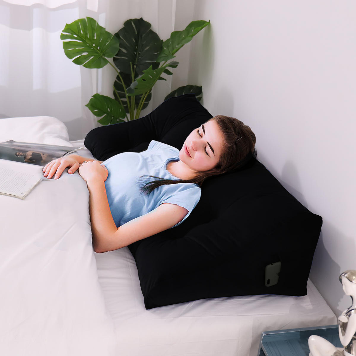 Эта большая контурная треугольная подушка для спины обеспечивает удобную и стабильную поддержку спины для двух или более человек одновременно, что делает ее идеальной для вас и вашей семьи, чтобы читать или смотреть телевизор, сидя в постели. Независимо от того, как вы наклоняетесь на эту подушку для чтения, она не сдвинется и не сломается так легко, как обычная подушка. Как подушка для изголовья, она не требует установки и проста в использовании, закрывая зазор между изголовьем и матрасом. Небольшие карманы по обеим сторонам клиновидной подушки легко хранят мелкие повседневные предметы, такие как мобильные телефоны, пульты дистанционного управления, очки и ручки. Подушки для кровати доступны в 9 стандартных размерах, чтобы соответствовать различным требованиям к ширине кровати. С одной из подушек длиной 200 см диван-кровать / односпальная кровать можно легко превратить в диван / кушетку. Эту подушку часто используют как подушку для общежития, глубокую спинку дивана, подушку для кемпера и т. д. Она также может помочь облегчить такие проблемы, как изжога и послеоперационная боль в спине. Еще больше возможностей для использования ждут своего открытия.