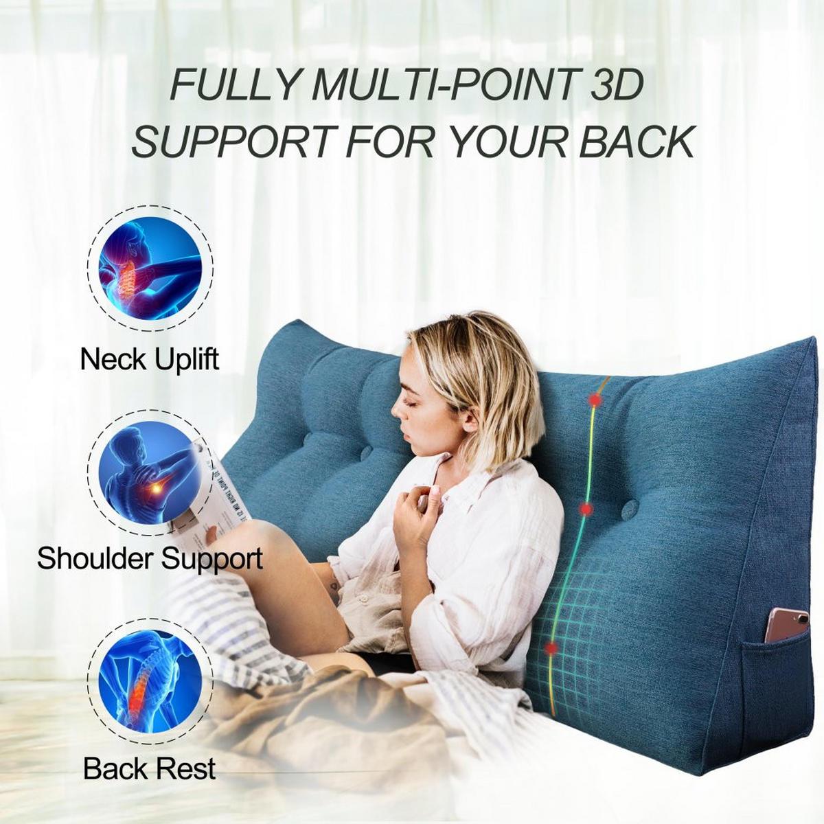 Эта большая треугольная подушка для спины обеспечивает удобную и стабильную поддержку спины для двух или более человек одновременно, что делает ее идеальным вариантом для вас и вашей семьи, чтобы читать или смотреть телевизор, сидя в постели. Независимо от того, как вы наклоняетесь на эту подушку для чтения, она не сдвинется и не сломается так легко, как обычная подушка. Как подушка для изголовья, она не требует установки и проста в использовании, закрывая зазор между изголовьем и матрасом. Небольшие карманы по обеим сторонам клиновидной подушки легко вмещают небольшие повседневные предметы, такие как мобильные телефоны, пульты дистанционного управления, очки и ручки. Подушки для кровати доступны в 9 стандартных размерах, чтобы соответствовать различным требованиям к ширине кровати. С одной из подушек длиной 200 см диван-кровать / односпальная кровать можно легко превратить в диван / кушетку. Эту подушку часто используют в качестве подушки для общежития, глубокой спинки дивана, подушки для прицепа на колесах, подушки для ограждения детской кроватки и т. д. Она также может помочь облегчить такие проблемы, как изжога и послеоперационная боль в спине. Еще больше возможностей для использования ждут своего открытия.