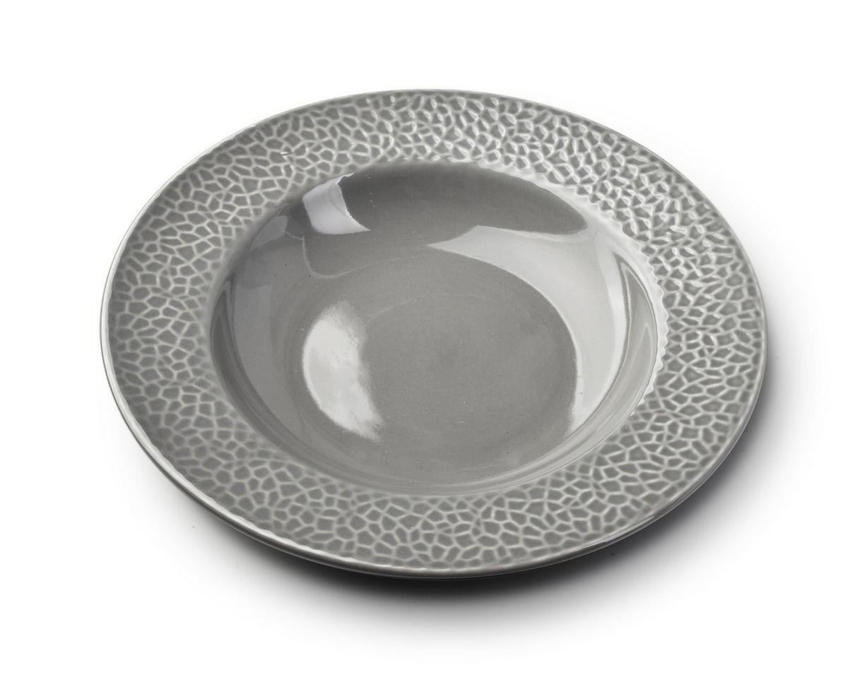 Круглая тарелка изготовлена из серого фарфора с глазурованным и рельефным покрытием. Она используется в ресторанах, отелях, пиццериях, кафе, частных домах и для кейтеринговых мероприятий. Тарелку можно мыть в посудомоечной машине и использовать в духовке.