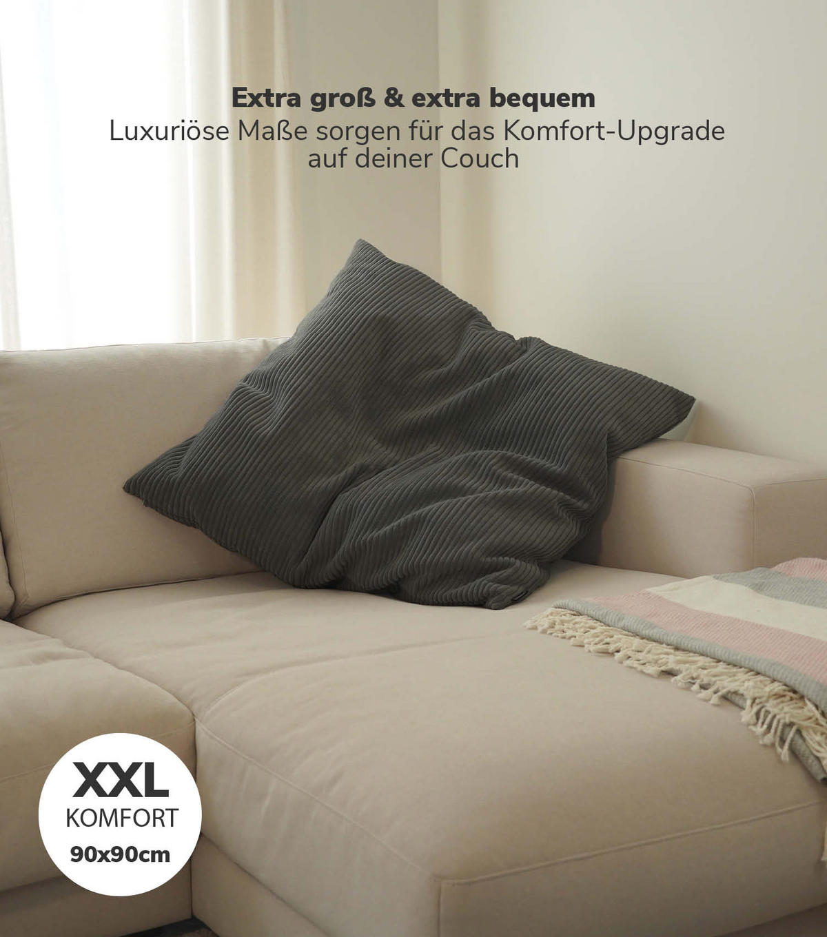 - МОДНАЯ ТКАНЬ: ВЕЛЬВЕЛЬ! Мягкая, приятная на ощупь вельветовая ткань делает Das Anschliegsame настоящей приманкой для глаз. Диванная подушка размером 90x90 см идеально подходит ко многим диванам и доступна в различных цветах, так что вы можете индивидуально и стильно дополнить свой диван.