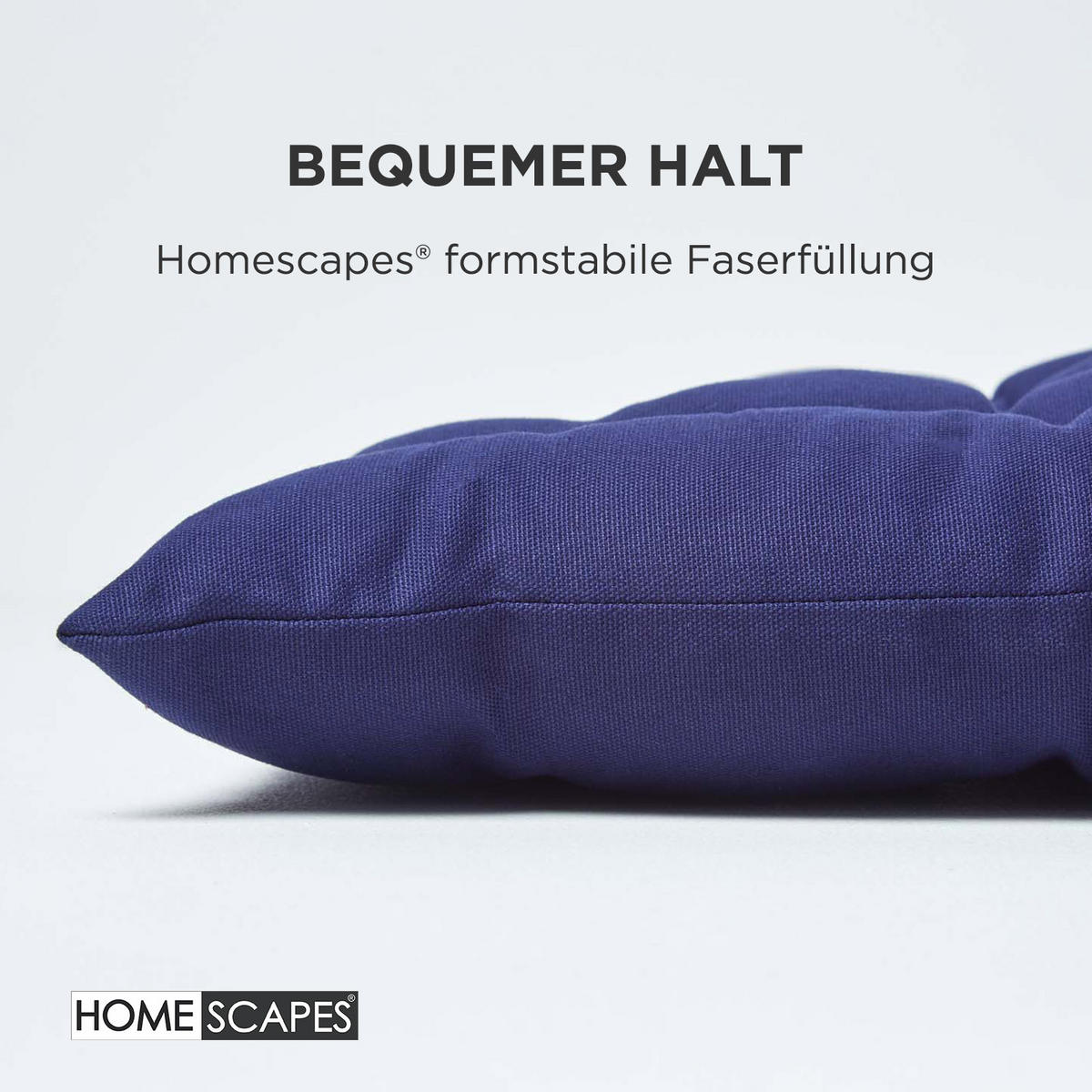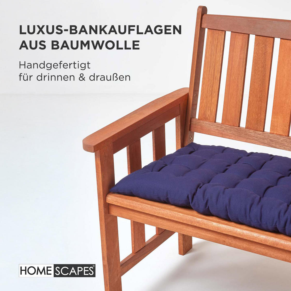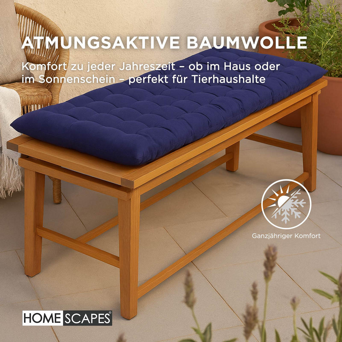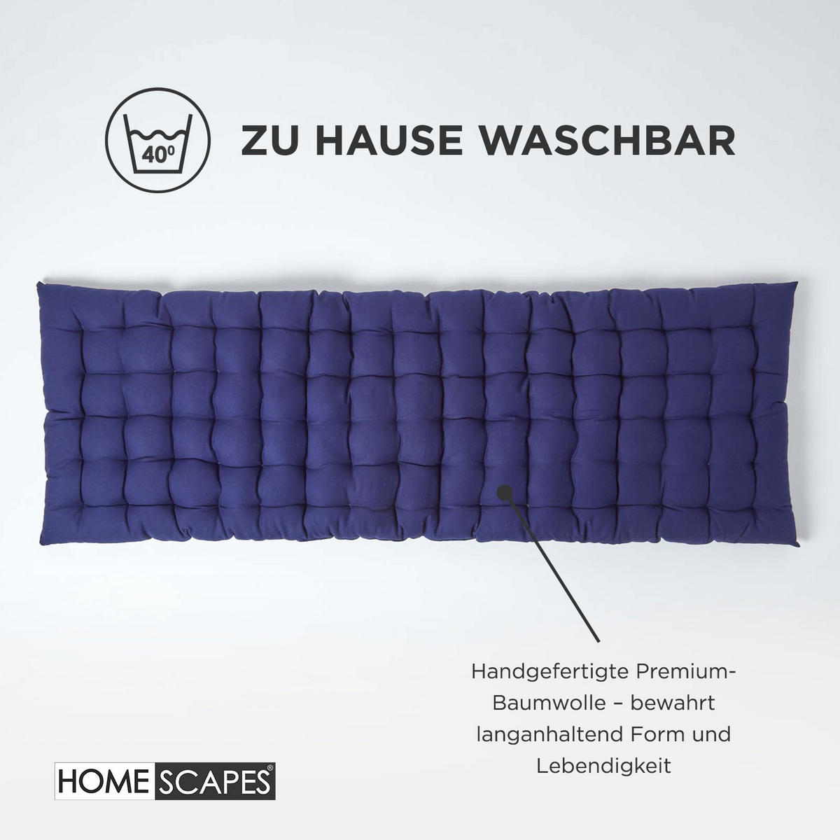 Подушки для скамеек Homescapes доступны в привлекательных цветах и двух размерах: 108 x 42 см для двухместных и 143 x 48 см для трехместных скамеек. Подушки для скамеек просты в уходе и их можно стирать в стиральной машине, они идеально подходят для повседневного использования. Благодаря чистому хлопковому чехлу подушки могут Однако они могут немного садиться после стирки. Обратите внимание, что подушки не являются водонепроницаемыми и не должны оставляться без защиты от непогоды, когда не используются.