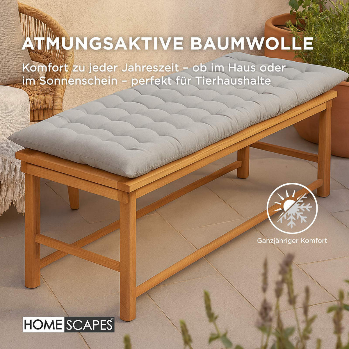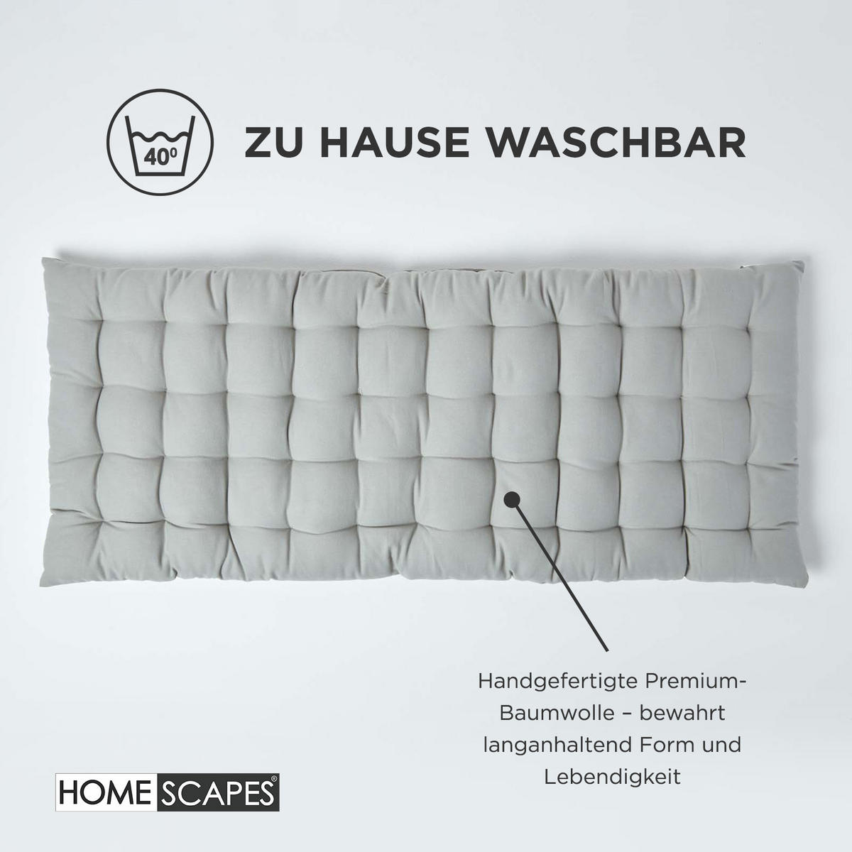 Подушки для скамеек Homescapes доступны в привлекательных цветах и двух размерах: 108 x 42 см для двухместных и 143 x 48 см для трехместных скамеек. Подушки для скамеек просты в уходе, их можно стирать в стиральной машине, и они идеально подходят для повседневного использования. Благодаря чистому хлопковому чехлу подушки могут Однако они могут немного садиться. Обратите внимание, что подушки не являются водонепроницаемыми и не должны оставляться без защиты от непогоды, когда не используются.
