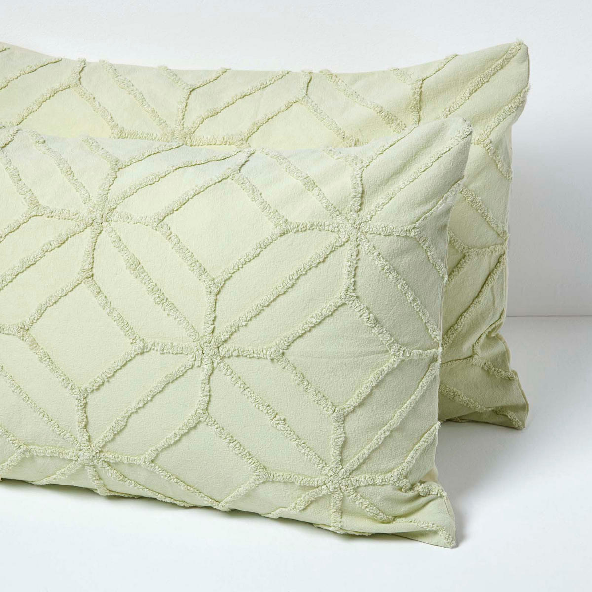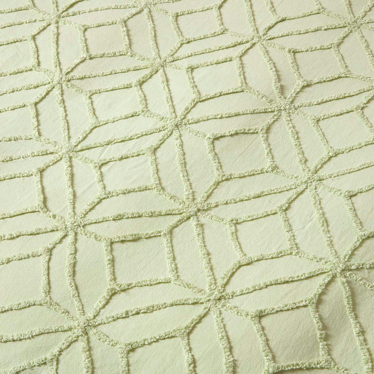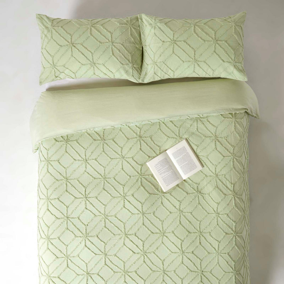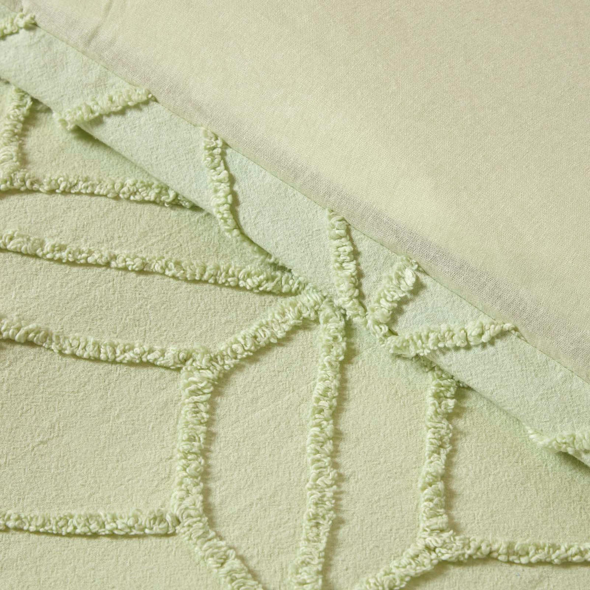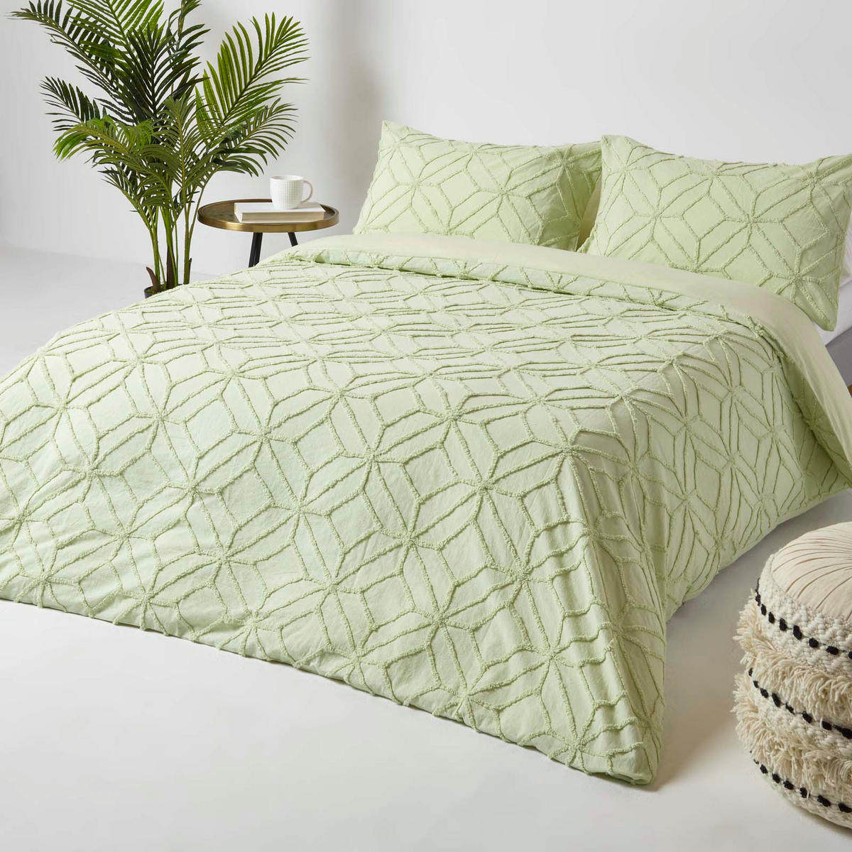 Постельное белье с стеганой нитью гармонирует практически с любым интерьером, от традиционного до ретро и современного, и идеально сочетается с модным стилем бохо. Комплект постельного белья с геометрическим рисунком доступен в белом и шалфейно-зеленом цветах и в различных размерах. Пододеяльники застегиваются на молнию, а наволочки имеют практичную откидную застежку.