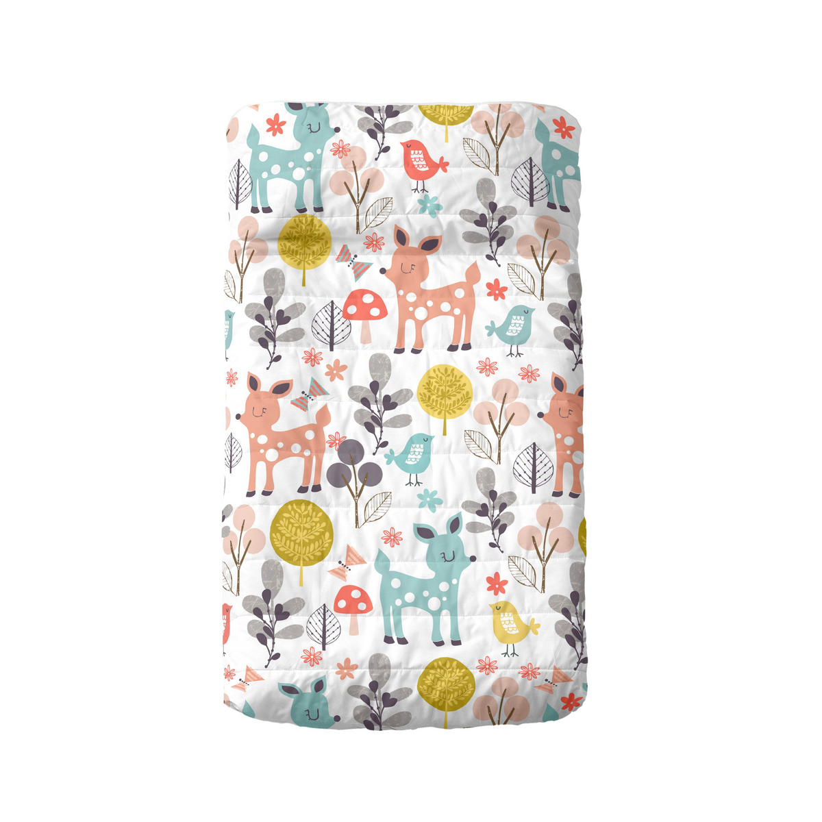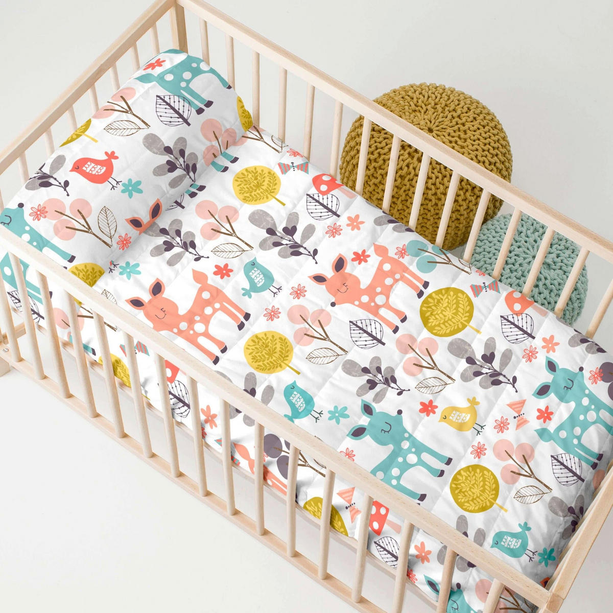 Украсьте комнату вашего ребенка покрывалом Moshi Moshi Woodlands с изображением растений и деревьев, а также разноцветных оленят и птиц, играющих с порхающими бабочками.