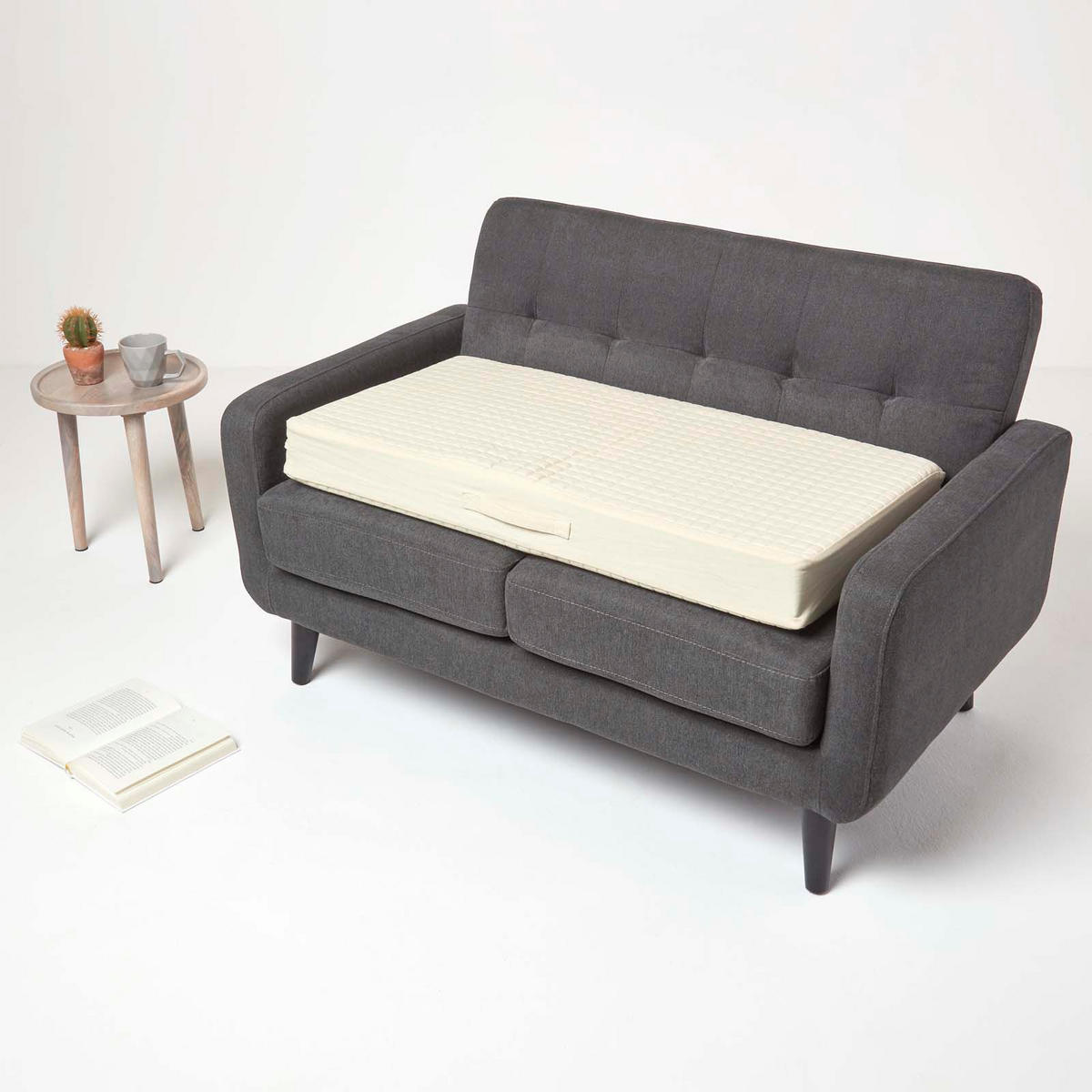 Плотная и упругая подушка сиденья для двухместного дивана с формоустойчивым наполнителем из ортопедической пены и прочным хлопковым чехлом. Размер подушки кремово-белого цвета: 100 x 50 см, толщина 10 см.