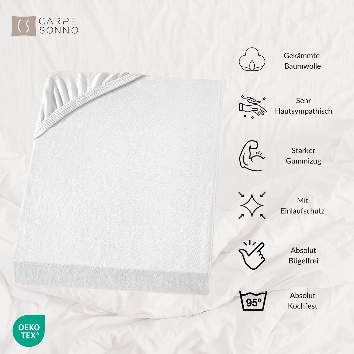 Простыня на резинке Carpe Sonno из джерси с очень высокой посадкой (до 50 см) для водяных и пружинных кроватей, изготовлена из 100% хлопка.