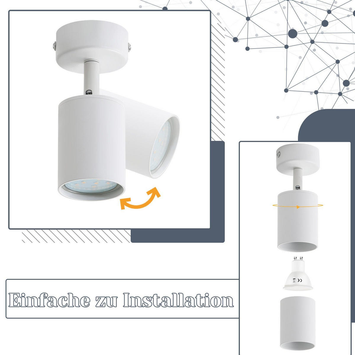- ПРОСТОТА УСТАНОВКИ: в комплект входят монтажные материалы и инструкция по сборке. Поворотный потолочный точечный светильник легко устанавливается на стену или потолок.