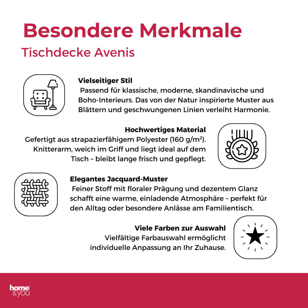 Жаккардовая скатерть avenis изготовлена из высококачественного полиэстера плотностью 160 г/м², который отличается прочностью и устойчивостью к сминанию. Мягкая, приятная на ощупь поверхность надолго сохраняет свой безупречный вид даже при регулярном использовании. Ткань красиво драпируется на столе и проста в уходе (ее можно быстро постирать в стиральной машине), поэтому вы сможете без труда наслаждаться свежестью.