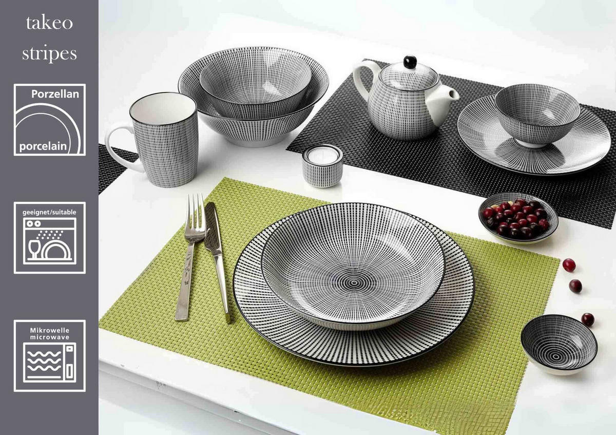 Takeo позволяет стильно сочетать и сочетать типичные азиатские дизайны рисовых мисок. В отличие от традиционных, узоры Takeo представлены исключительно в черном цвете, любимом пуристами и минималистами, что придает посуде простой скандинавский штрих. Особая привлекательность заключается в том, что узоры нанесены на всю поверхность всех предметов посуды, а на некоторых предметах - как внутри, так и снаружи, что позволяет по-настоящему подчеркнуть красоту орнамента.