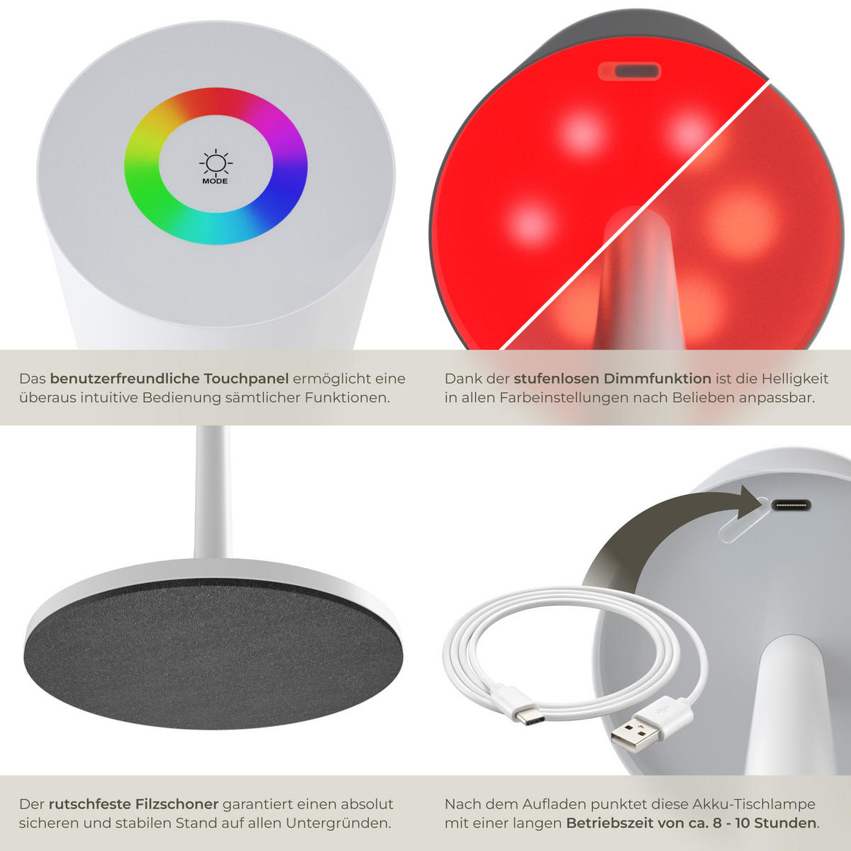 Благодаря функции плавного диммирования вы можете регулировать яркость лампы в соответствии с текущей ситуацией и настроением длительным нажатием сенсорной кнопки. Помимо теплого белого цвета вы также можете выбрать один из семи различных цветов из цветового пространства RGB: от интенсивного красного до яркого зеленого.