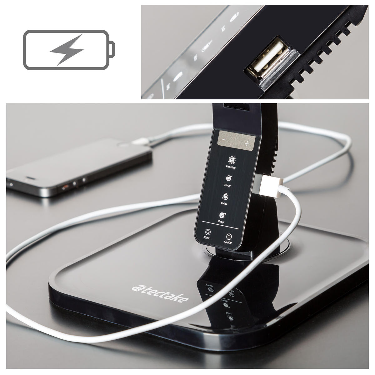 Особенно практично: встроенный порт USB позволяет заряжать смартфон или другие устройства прямо на лампе без необходимости искать отдельную розетку.