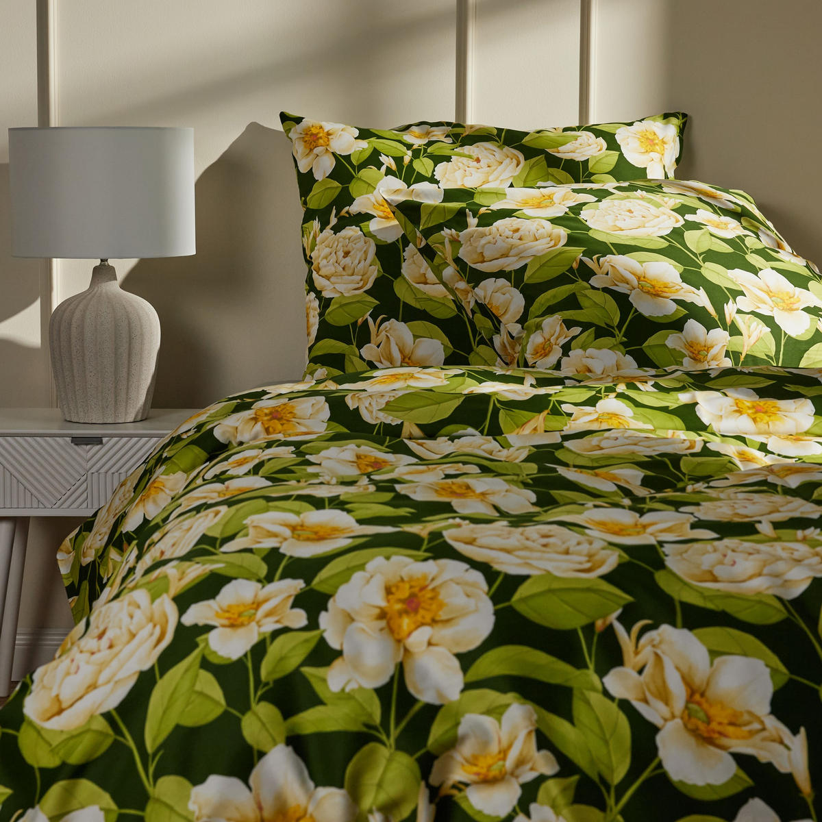 Комплект постельного белья Fenilla - идеальный выбор для тех, кто ценит комфорт и стильный сон круглый год. Изготовленный из высококачественного хлопкового сатина, он мягкий и уютный, а темно-зеленый цветочный узор добавит элегантности вашей спальне. В комплект входят пододеяльник размером 200 x 220 см и две наволочки размером 70 x 80 см на молнии. Удобная упаковка делает его идеальным подарком.