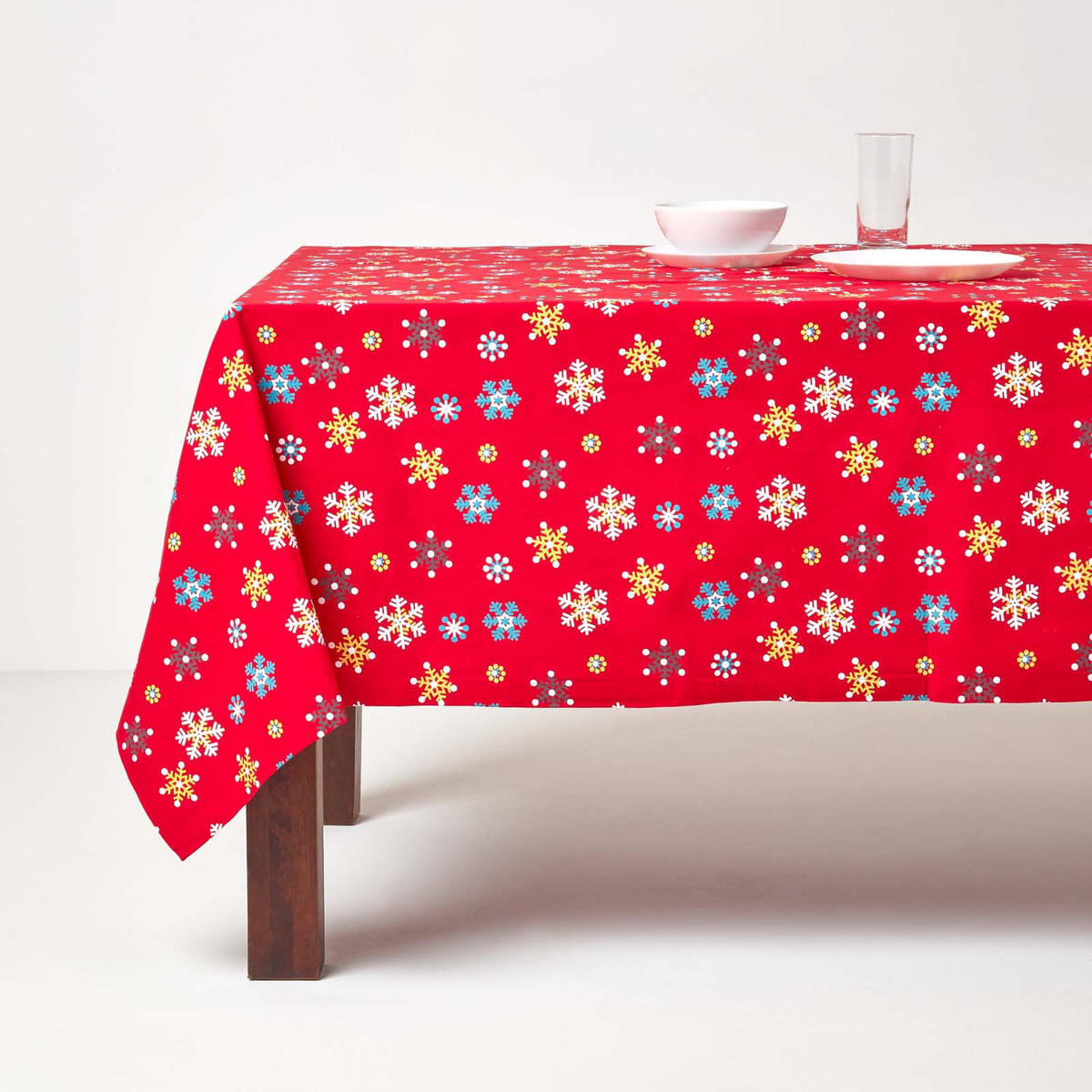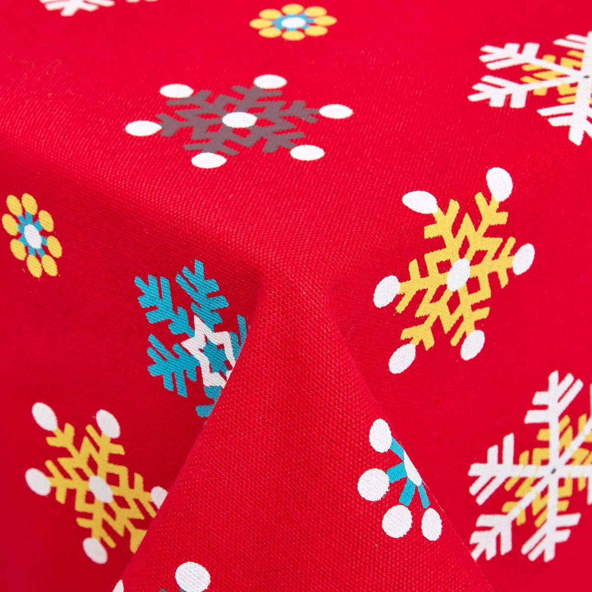 Красная рождественская скатерть со снежинками - красочное украшение для вашего праздничного столаКрасная скатерть из эксклюзивной рождественской коллекции Homescapes привнесет яркие краски и создаст праздничную атмосферу на ваш обеденный стол. Узор из снежинок в ярких цветах распространит рождественское волшебство и обеспечит радостную атмосферу рождественского ужина. Атмосфера.