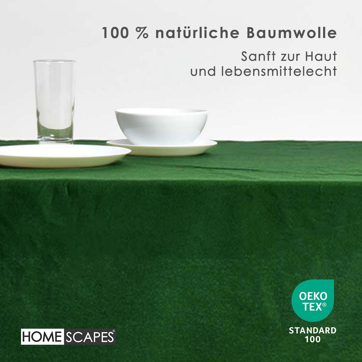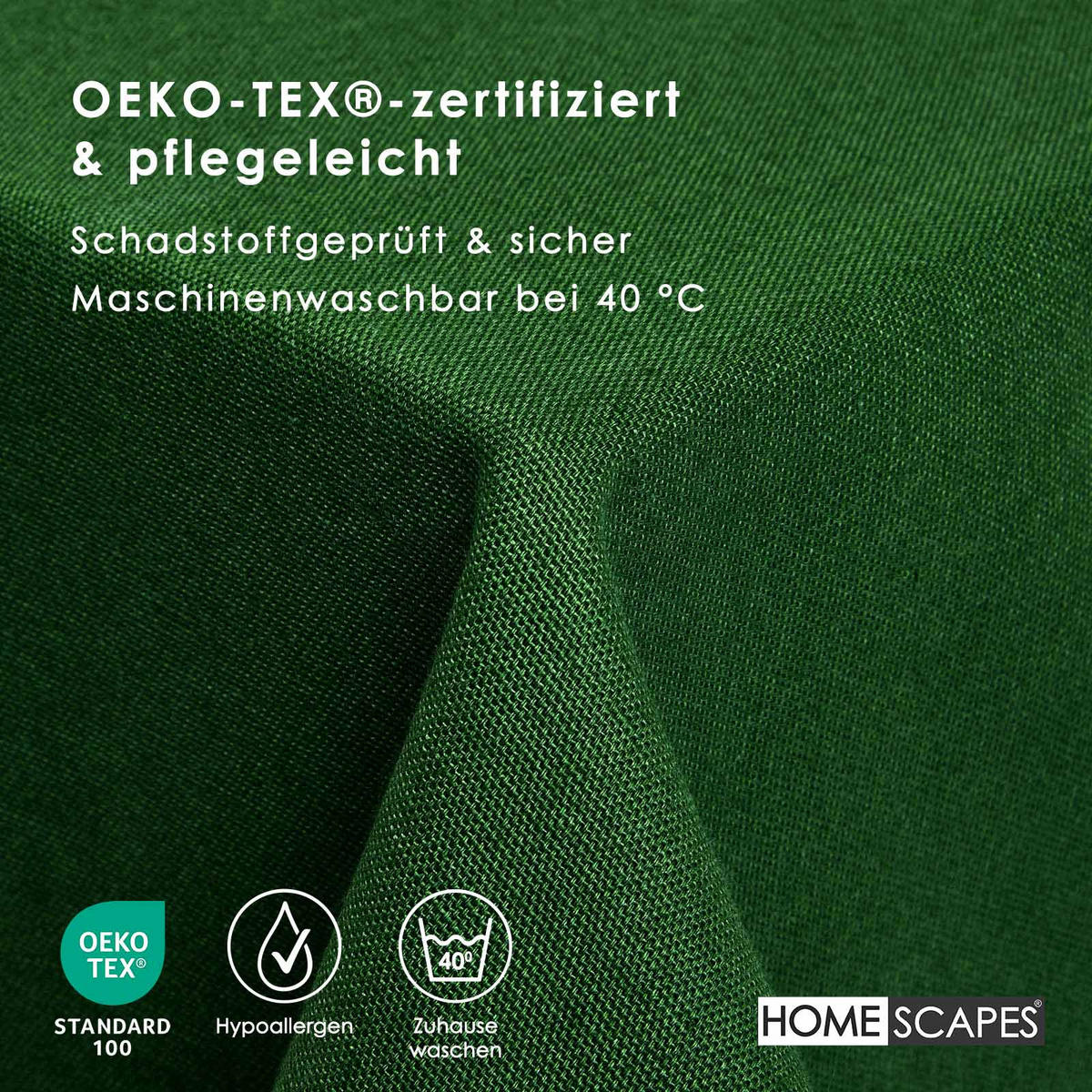 Темно-зеленая скатерть - вечная красота и ручная работаЭта элегантная скатерть глубокого темно-зеленого цвета придаст вашему обеденному столу элегантный и гармоничный штрих - идеально подходит для повседневного использования и особых случаев. Изготовленная из 100% хлопка и сертифицированная OEKO-TEX, она впечатляет своим высоким качеством изготовления и приятным ощущением материала.