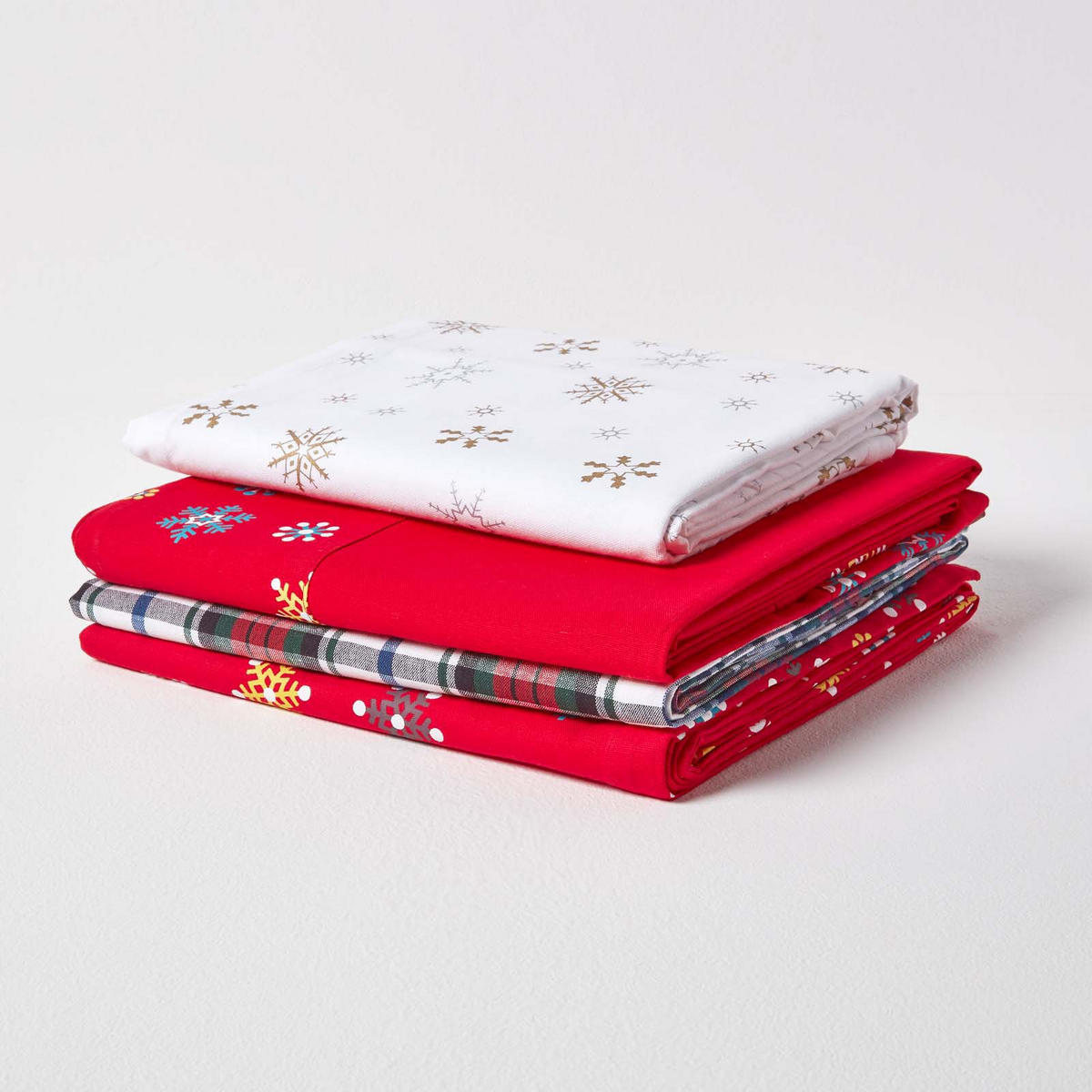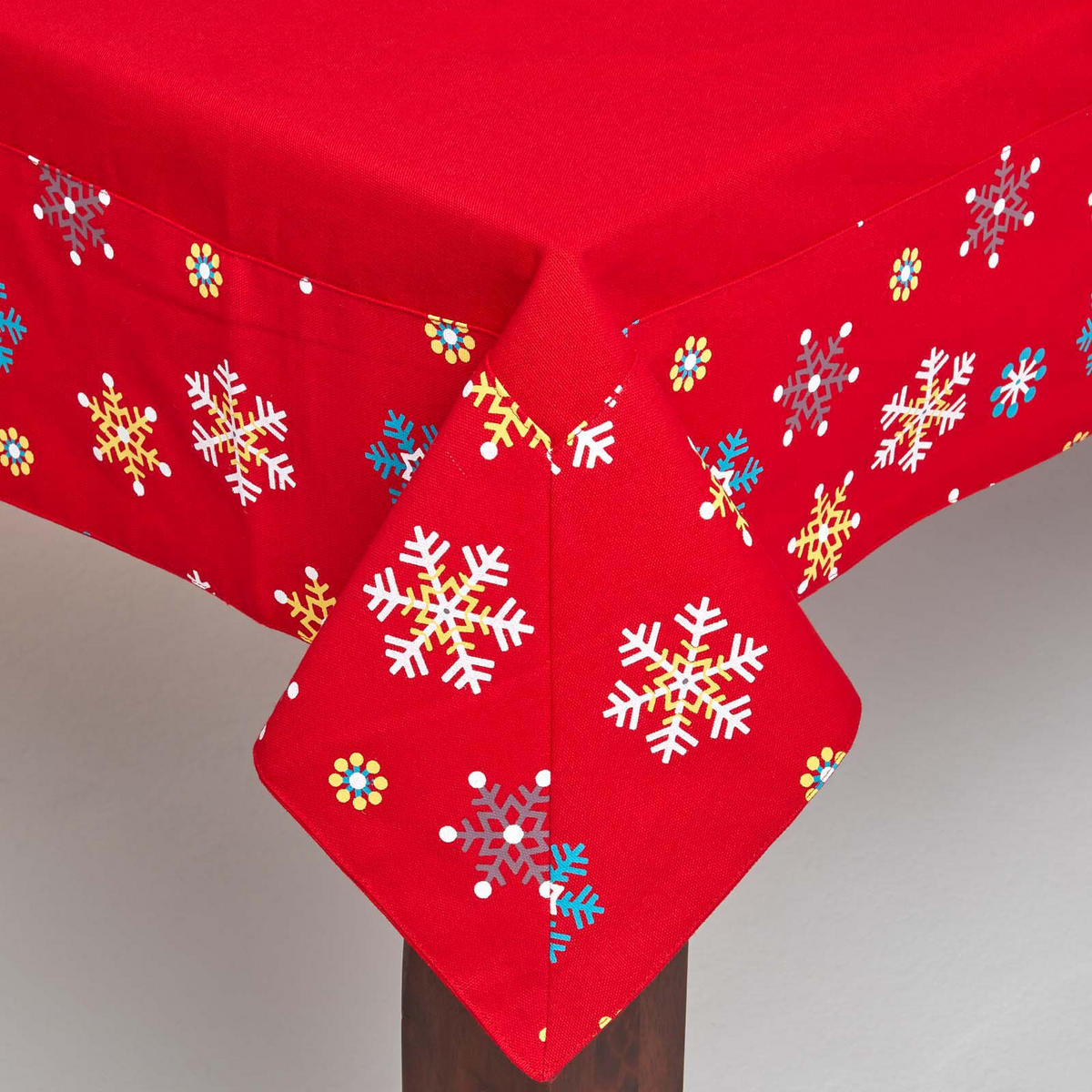 Красная рождественская скатерть с каймой - праздничная и красочнаяКрасная скатерть с каймой из эксклюзивной рождественской коллекции Homescapes добавит красочных акцентов вашему обеденному столу. Широкая кайма с разноцветными снежинками придаст вашему праздничному столу радостное настроение, а праздничный красный цвет основы гармонично дополнит атмосферный дизайн.