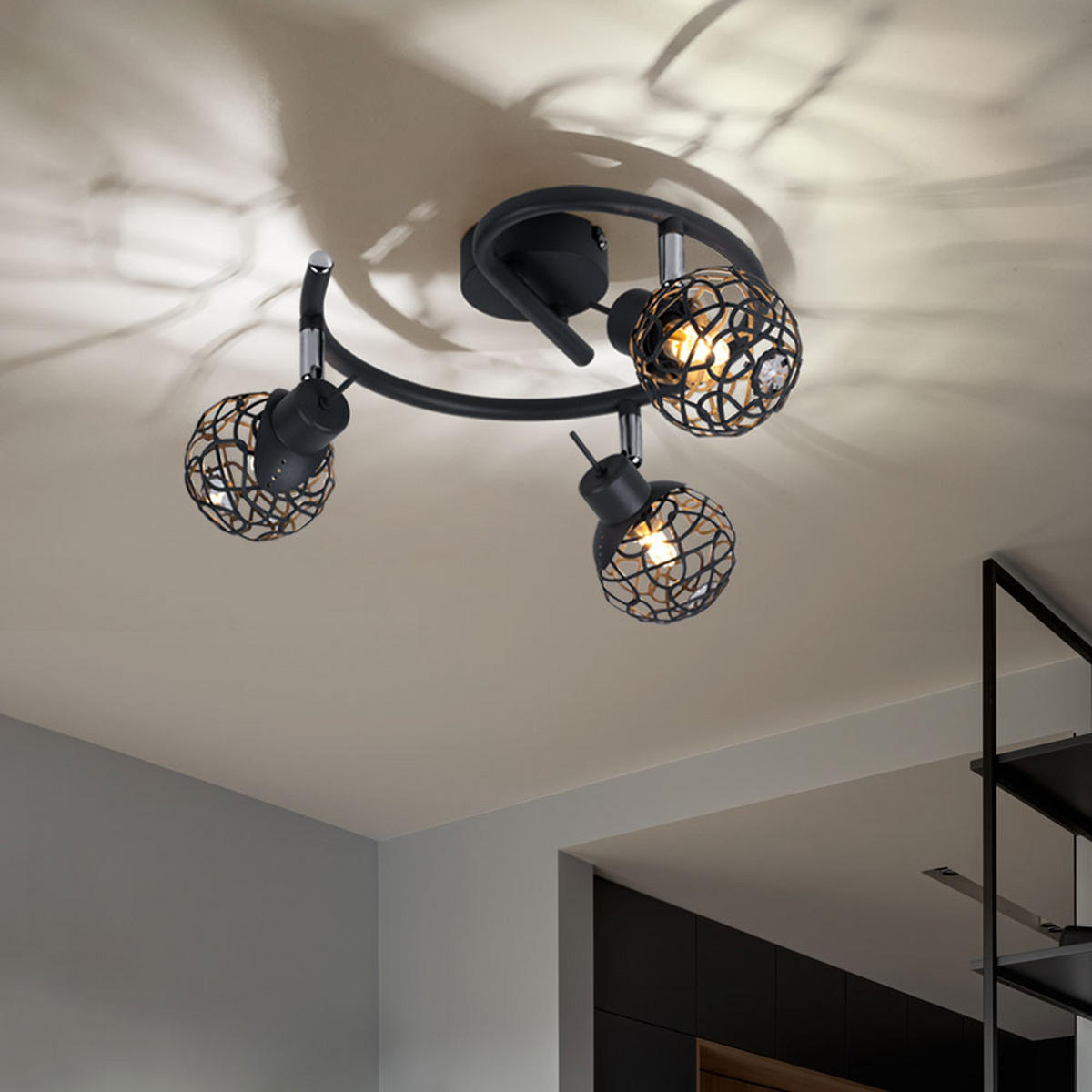 Этот современный потолочный светильник впечатляет серым металлическим каркасом и изящным абажуром с хрустальным эффектом и плетеной структурой. Три плафона можно поворачивать по отдельности, что позволяет точно направлять свет. Эта стильная модель идеально подходит для гостиной, столовой или прихожей. Светильник не имеет лампочки и выключателя, что позволяет гибко выбирать источник света. Диаметр светильника составляет 25 см, а высота - 14 см, что позволяет экономить пространство и при этом сохранять впечатляющий внешний вид.