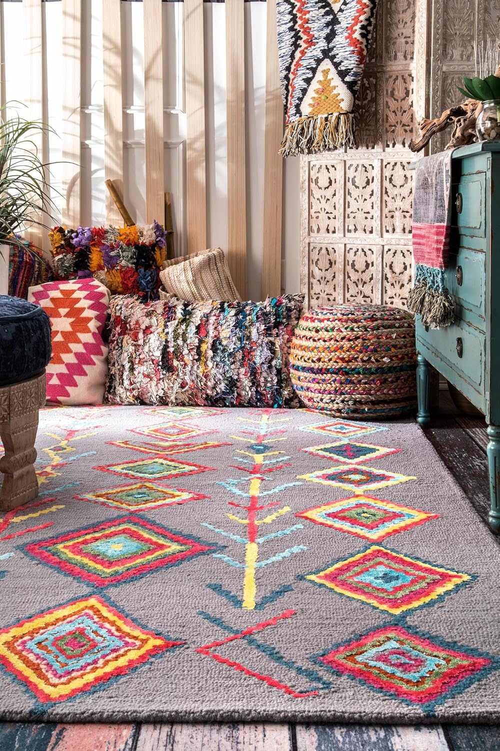 70% шерсть, 30% вискоза, сделано в Индии Ручная работа гарантирует прочность и долговечность этого ковра. Добавьте тепла в вашу гостиную, спальню, столовую, кухню или прихожую, добавив стиль, долговечность и комфорт с этим шерстяным ковром. Богемские ковры, наполненные художественным очарованием, помогут вам раскрыть свой творческий потенциал. Шерстяные ковры часто линяют. Помимо регулярной уборки пылесосом, протрите пол под ковром. Разливы и пятна можно аккуратно промокнуть чистой белой тканью.