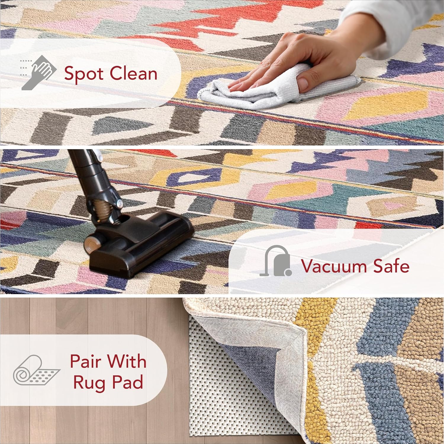 Стиль: Contemporary Расцветка: Geometric Способ изготовления: Tufted Состав ворса: Wool Состав основы: No Backing Уличный/для помещений: Indoor Тип помещения: Bathroom, Bedroom, Dining Room, Hallway, Kitchen, Living Room Форма: Rectangular Высота: Medium Pile Толщина: 0.45 Inches Количество штук: 1 Рекомендации по уходу: Hand Wash Only Устойчивый к пятнам: No Особенности: Durable