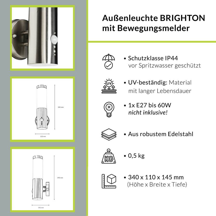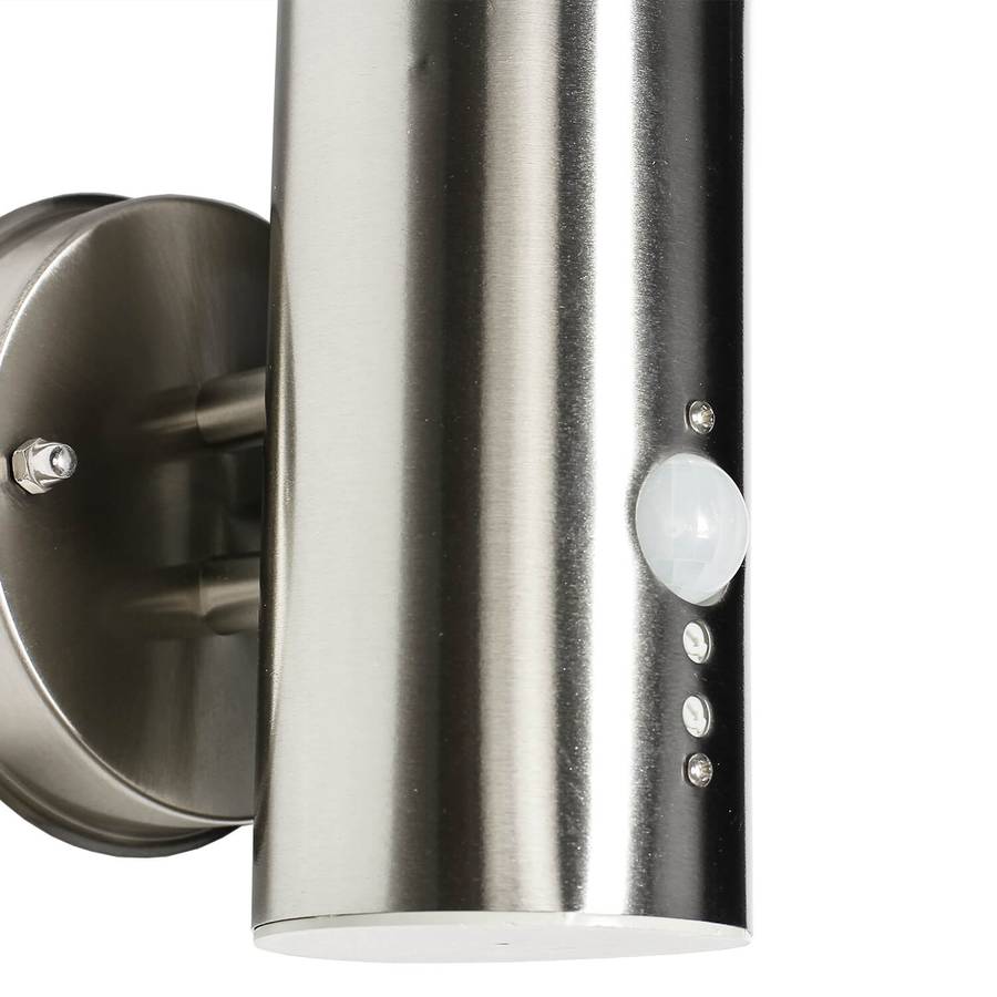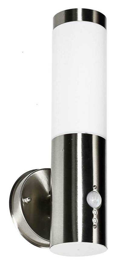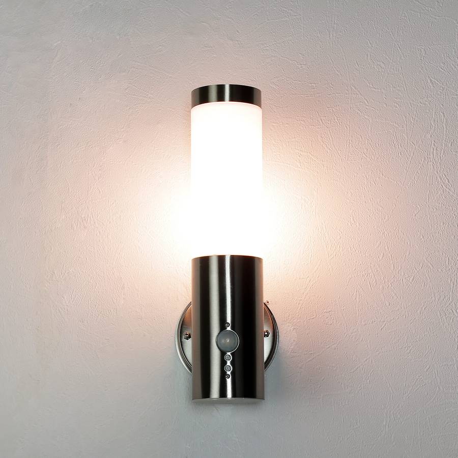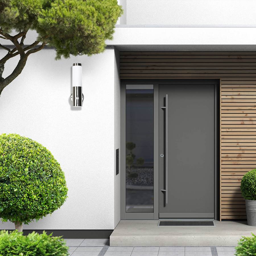 Уличный настенный светильник с датчиком движения и малым бликованием для входных зон, садов и террас - Датчик: угол обнаружения 120°, дальность обнаружения до 8 метров (в зависимости от погоды и места установки) | Регулируемая чувствительность и продолжительность свечения (плавно регулируется от 10 до 240 секунд) - Пластиковый рассеиватель в верхней части настенного светильника рассеивает свет с малым бликованием и предотвращает визуальные помехи - Специальное прозрачное лаковое покрытие для защиты от УФ-излучения предотвращает пожелтение - Диаметр настенного кронштейна: 110 мм, расстояние между отверстиями: 90 мм | Светильник поставляется с монтажными материалами - IP44: защита от брызг; высокая защита от влаги и посторонних предметов > 1 мм - Свободный выбор источника света: яркость и цвет света можно изменять и индивидуально проектировать с помощью самостоятельно подобранных светодиодных источников света | Рекомендуются короткие и узкие лампочки с максимальным диаметром 58 мм. Не входят в комплект. - Проверенное качество, сертифицированное Немецким институтом защиты прав потребителей в соответствии с DVN:5001 - Light Experiences 1511