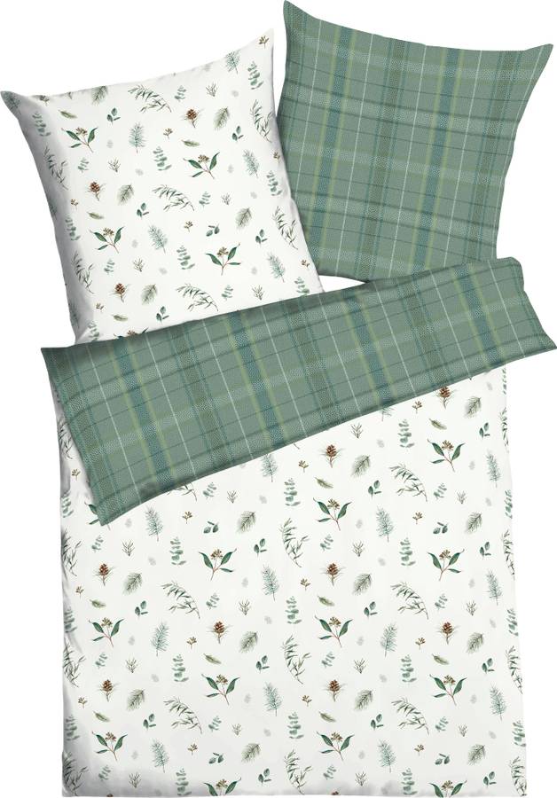 Двустороннее фланелевое постельное белье Kaeppel "Зимняя зелень". Разнообразные ветки привносят в ваш сон ощущение природы. Классическая клетчатая изнаночная сторона создает уютный контраст. Мягкая ткань из чистого хлопка поражает своим высоким качеством: она плотно сплетена и аккуратно расчесана. Благодаря этому она особенно мягкая, пушистая и приятная на ощупь. Уютное покрывало, которое согреет вас уютом в прохладные ночи. Легко гладится, дышащее, регулирует температуру и влажность. Молния, экономящая труд, значительно облегчает смену постельного белья.