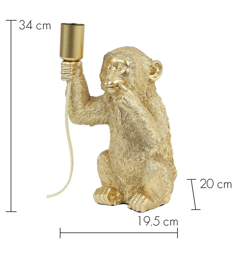 Эта лампа станет настоящей приманкой для вашей гостиной. Благодаря игривому дизайну и компактному размеру, ее можно разместить в любом месте, где нужно дополнительное освещение. Она очень милая, ведь обезьянка держит лампу в своей руке. Она идеально подходит для полки или стильного приставного столика. Дополните ее соседним растением, чтобы создать атмосферу джунглей. Размеры лампы: 20 x 19,5 x 34 см. Используйте лампочку E27 для этой золотой настольной лампы.