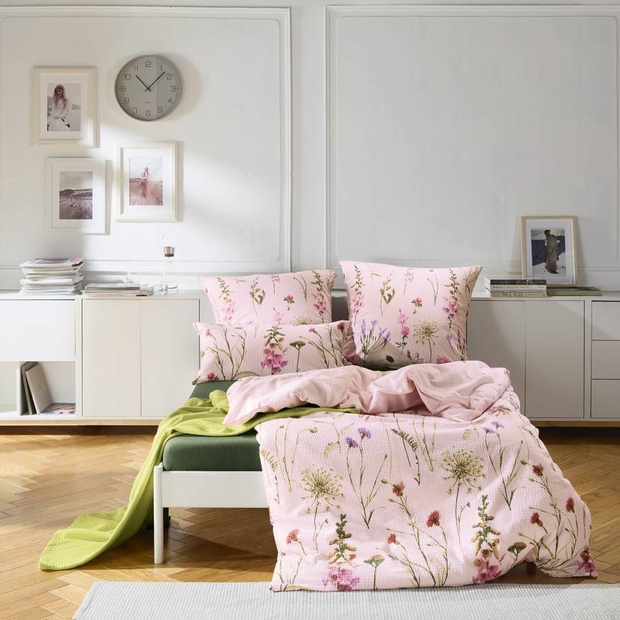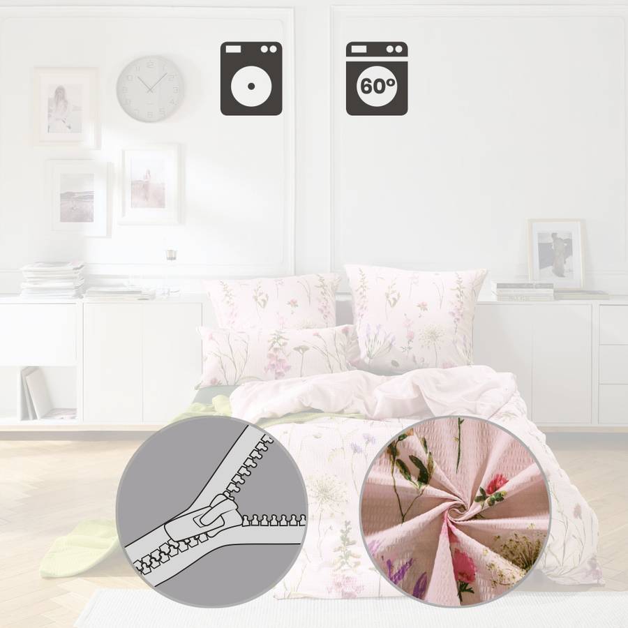 Постельное белье REDBEST из сирсакера. Сказочные луговые цветы создадут очаровательную атмосферу в вашей спальне. Мечты сбываются в этой летней, легкой, ароматной и нежной ткани с характерной креповой текстурой. Вы быстро оцените особые свойства этой легкой в уходе ткани, которая не требует глажки и застегивается на молнию: просто постирайте, высушите и наденьте.