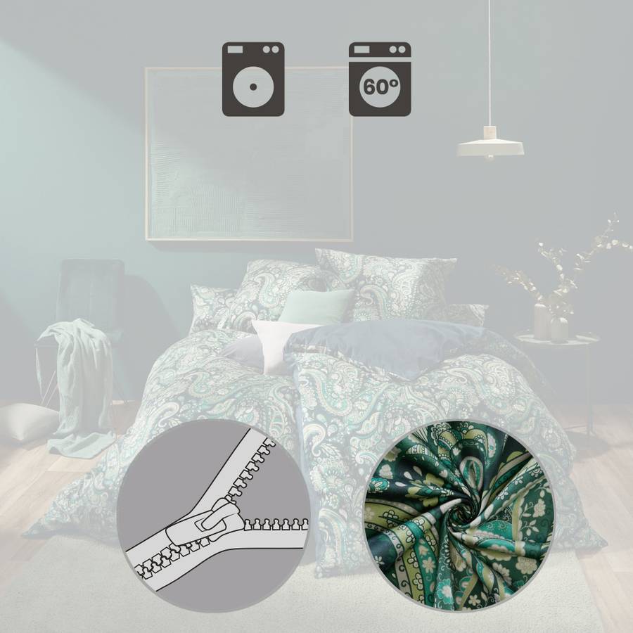 Постельное белье из сатина REDBEST. Очаровательный узор пейсли придаст вашей спальне стиль и изысканность. Для тех, кто предпочитает более сдержанный стиль, однотонная изнаночная сторона пододеяльника создаст приятный контраст. Высококачественная цифровая печать придает рисунку долговечную яркость. Побалуйте себя гладкой, мягкой и эластичной тканью с характерным шелковистым блеском. Он не только регулирует температуру, дышащий и приятный для кожи, но и прост в уходе и надевании благодаря молнии.