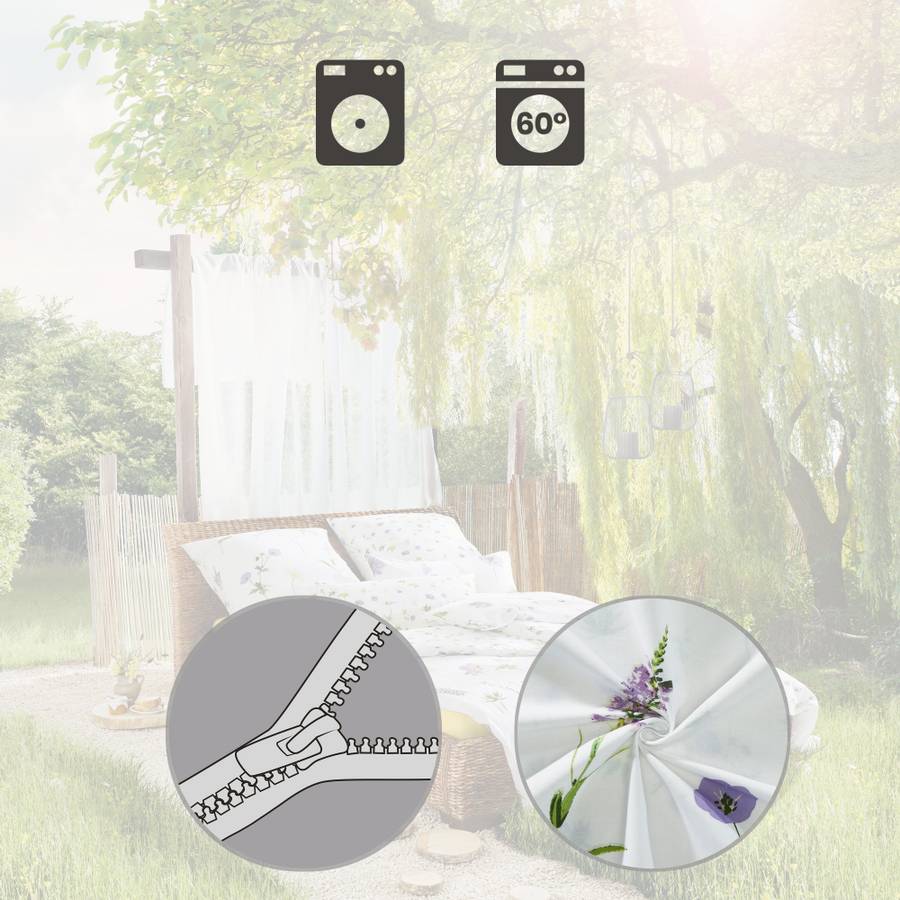 Двустороннее постельное белье REDBEST Renforcé. Яркие луговые цветы в двух гармоничных дизайнах можно комбинировать по желанию, создавая очаровательную атмосферу в вашей спальне. Гладкая ткань прекрасно передает цвета. Эта терморегулирующая ткань не только приятна для кожи и дышащая, но и отличается высокой прочностью. Быстро надевается благодаря практичной молнии.