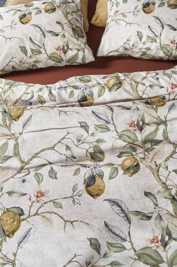 Представьте себя в итальянских просторах с фруктовым дизайном пододеяльника Lemon Tree от At Home by Bedding House... но зимой! Ведь этот пододеяльник сшит из фланели - тонкой, теплой ткани, под которой особенно приятно уютно укутаться зимой. Передняя и задняя части пододеяльника имеют одинаковый принт. Пододеяльник упакован в красивый тканевый чехол из той же ткани, что и пододеяльник. Чехол не только многоразовый, но и позволяет увидеть и потрогать принт чехла.