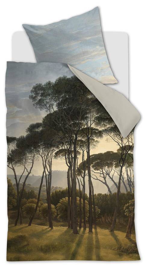 Дизайн пододеяльника Nature от Ambiante изображает прекрасный итальянский пейзаж. Сосны на переднем плане красиво оттеняются синим, песочным и укрю цветами неба. Пододеяльник и наволочки имеют простую изнанку песочного цвета. Пододеяльник Nature прекрасно впишется как в классический, так и в современный интерьер.