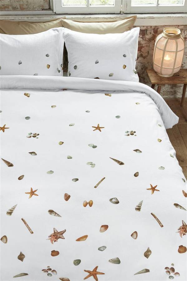 Пододеяльник Seaside украшен принтом в виде ракушек и морских звезд, нарисованных вручную Марджолейн Бастин. Этот пододеяльник украшен коллекцией ракушек желтого, серого и натурального цветов, а также оранжевыми морскими звездами. Ракушки расположены на пододеяльнике в градиентном стиле; большинство мотивов ракушек расположено в нижней части, а верхняя часть преимущественно белая. Это придает пододеяльнику игривый вид в деревенском стиле. Этот пододеяльник идеально впишется в спальню в деревенском и классическом стиле. Дизайн вдохновлен атмосферными рисунками Марджолейн Бастин, изображающими сельскую местность.