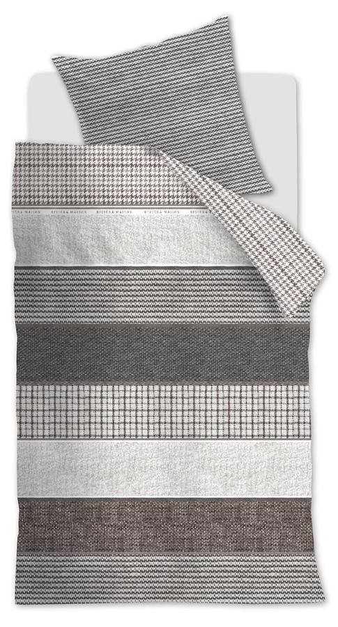 Постельное белье Tailor украшено узором из нескольких полос, составленным из принтов зимних тканей. Прекрасные принты панелей из трикотажа, букле и бархата в сочетании с серым, коричневым, бежевым и белым цветами делают это покрывало настоящей приманкой для глаз в любой спальне. Логотип Text Riviera изящно вплетен в одну из полос на покрывале.