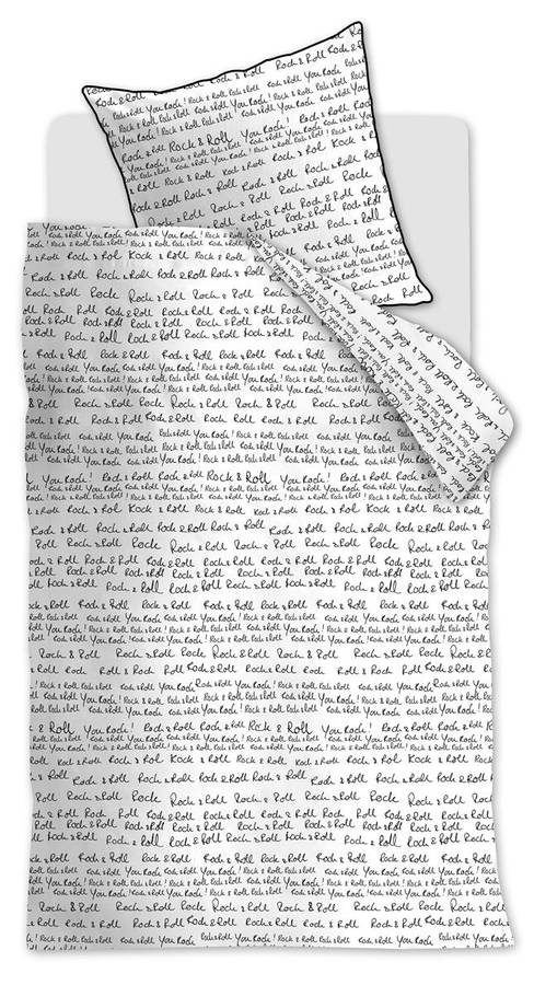 Вы просто супер! С постельным бельем Rock & Roll от vtwonen! Пододеяльник выполнен из чистого хлопка с черным рисунком по всей поверхности и рукописной надписью Rock & Roll. Наволочки отделаны плотным черным шнуром по всему периметру. Наволочки и пододеяльник имеют одинаковый рисунок и идентичный дизайн с лицевой и изнаночной стороны.