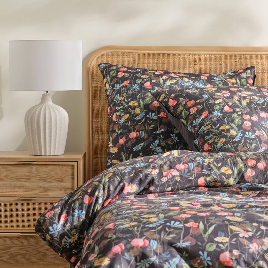 Элегантное постельное белье из микрофибры и полиэстера глубокого черного цвета, украшенное нежным цветочным узором. Мягкое и легкое, оно обеспечивает комфортный сон и добавляет современный штрих в спальню.