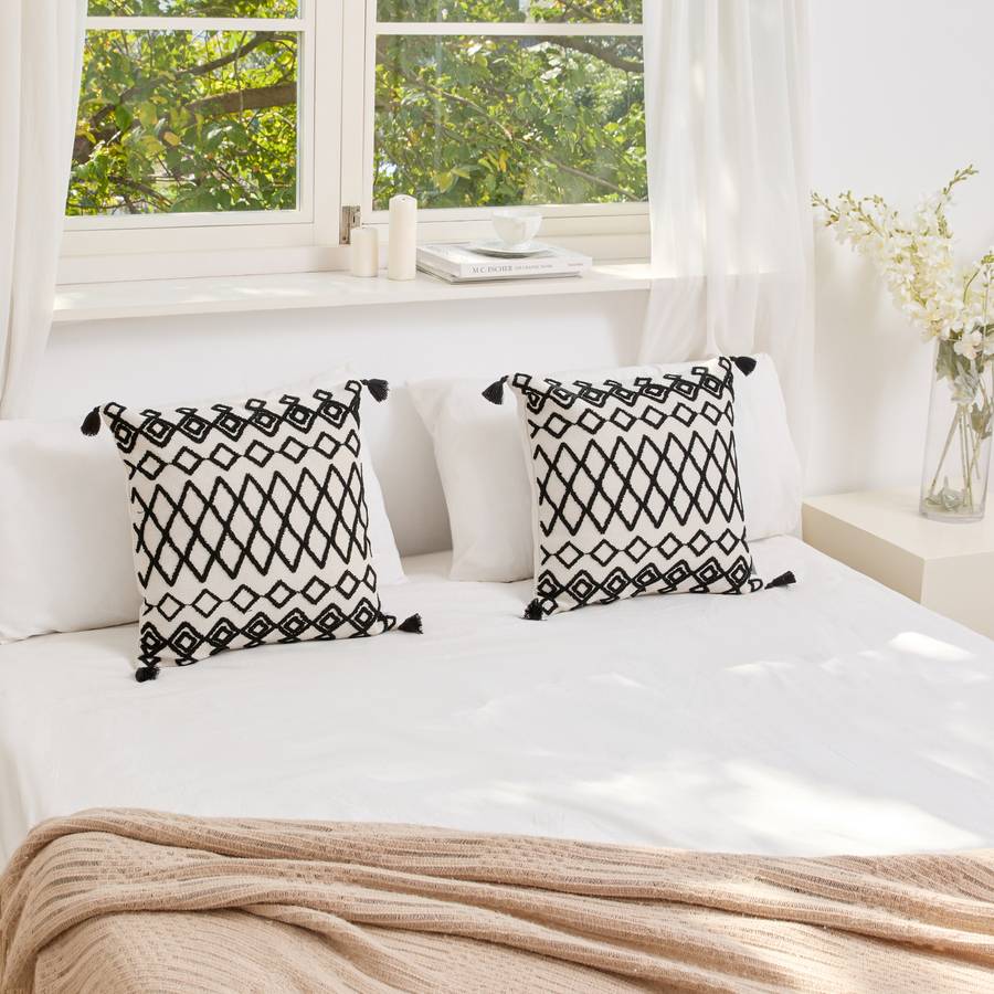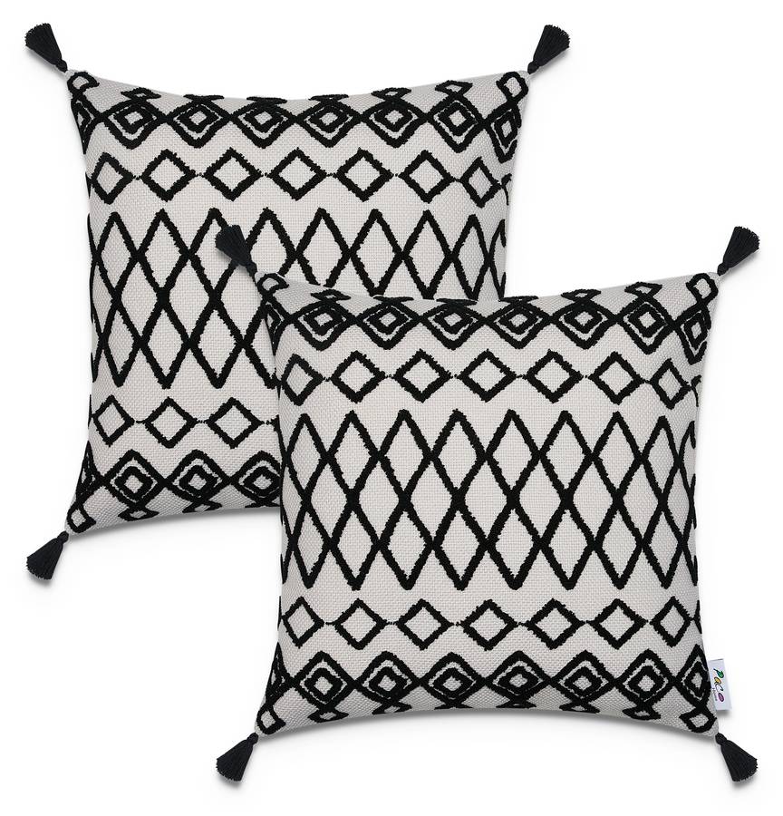 ВНЕШНИЙ ВИД - Эти наволочки в строгом черно-белом цвете украшены современными ромбовидными узорами и украшены игривыми кисточками.