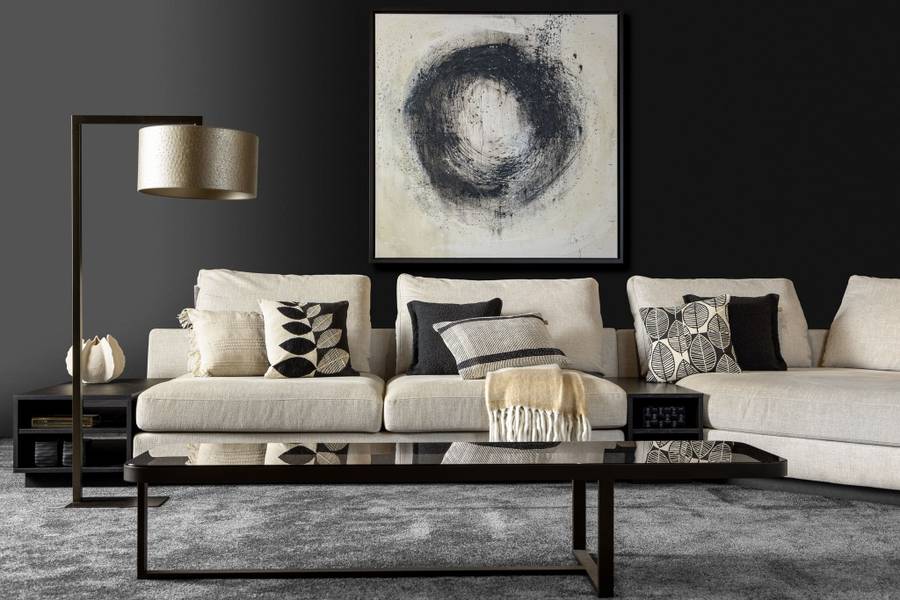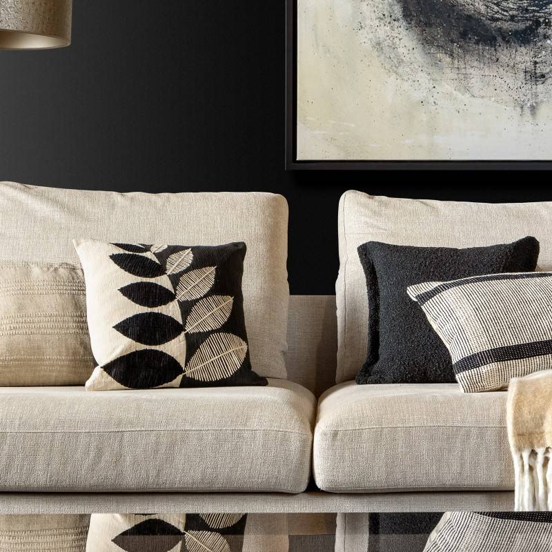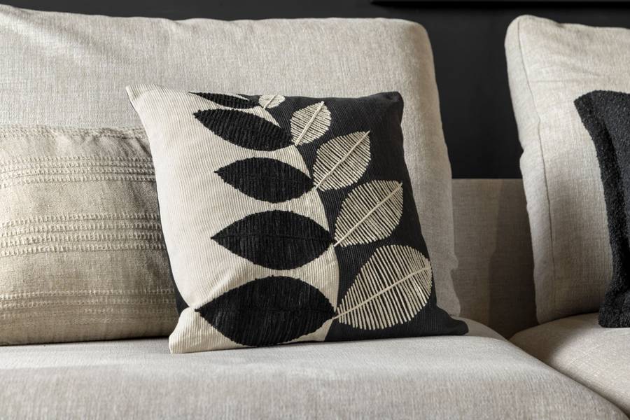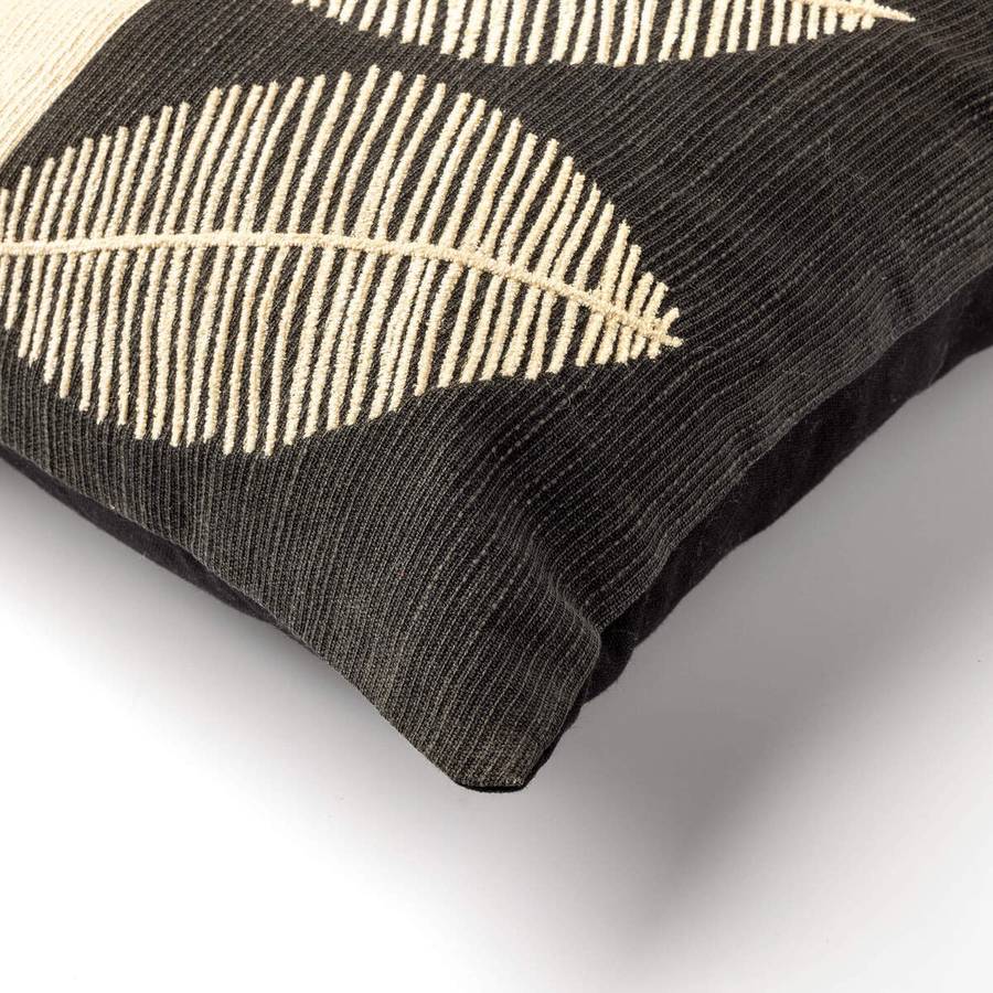 Наволочка размером 45 x 45 см с натуральным рисунком в виде листьев в черно-бежевых тонах. Лицевая сторона выполнена из прочной фактурной ткани с ребристой поверхностью, которая эффектно подчеркивает рисунок. Фон разделен на два цветных поля, что еще больше подчеркивает дизайн.