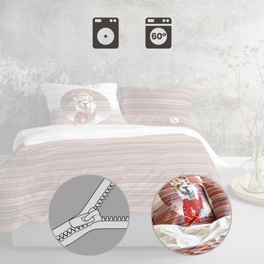 Премиальное фланелевое постельное белье Irisette. Это постельное белье излучает истинный уют благодаря своему красочному трикотажному узору. Милый рисунок ламы на двусторонней наволочке по-настоящему притягивает взгляд. Позвольте мягкому бархатному ворсу перенести вас в страну снов. Холодными зимними вечерами этот пушистый, мягкий и приятно легкий материал премиум-класса очаровывает своей невероятной мягкостью. Он сочетает в себе исключительную мягкость и тончайшую хлопковую пряжу. Этот эксклюзивный, высококачественный продукт не только поддерживает температуру, регулирует влажность и приятен для кожи, но также прост в уходе и легко надевается благодаря практичной молнии.