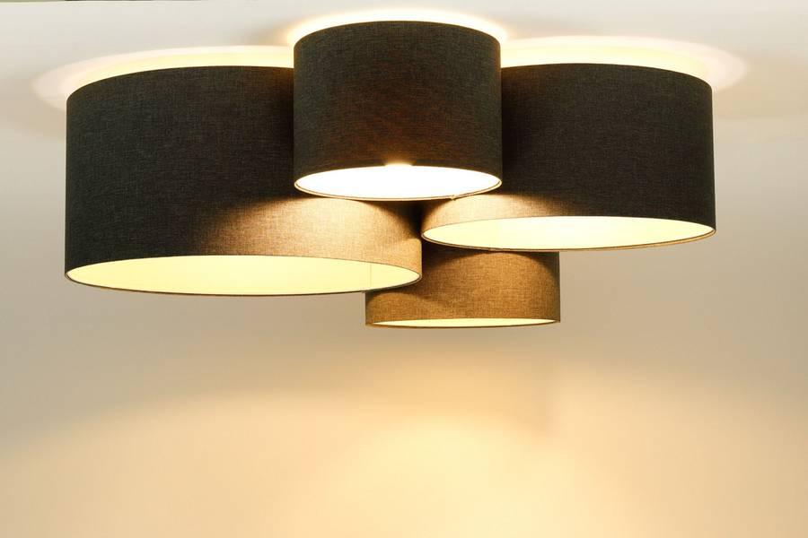 Потолочный светильник с четырьмя абажурами из фактурной ткани пастельных тонов. Некоторые абажуры могут быть изготовлены из натуральной джутовой ткани с небольшими неровностями, вкраплениями темных нитей и легким естественным ароматом, характерным для натуральных материалов. Обеспечивает мягкий и теплый свет в вашей комнате.