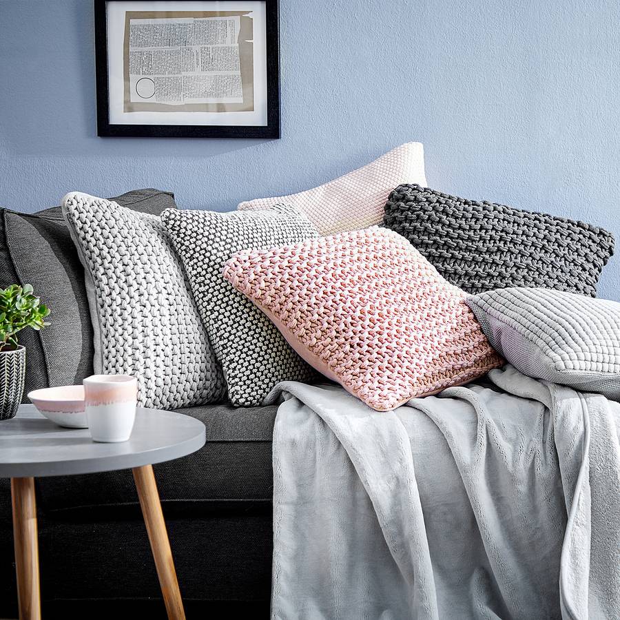 Два справа, два слева, два капа? Мягкая подушка-спица размером 50 х 50 см связана чуть более изобретательно. Модная крупная вязка с изнаночной стороны. Вы будете готовы к зимнему сезону в мгновение ока. Доступно в других цветах, идеально подходит для комбинирования.