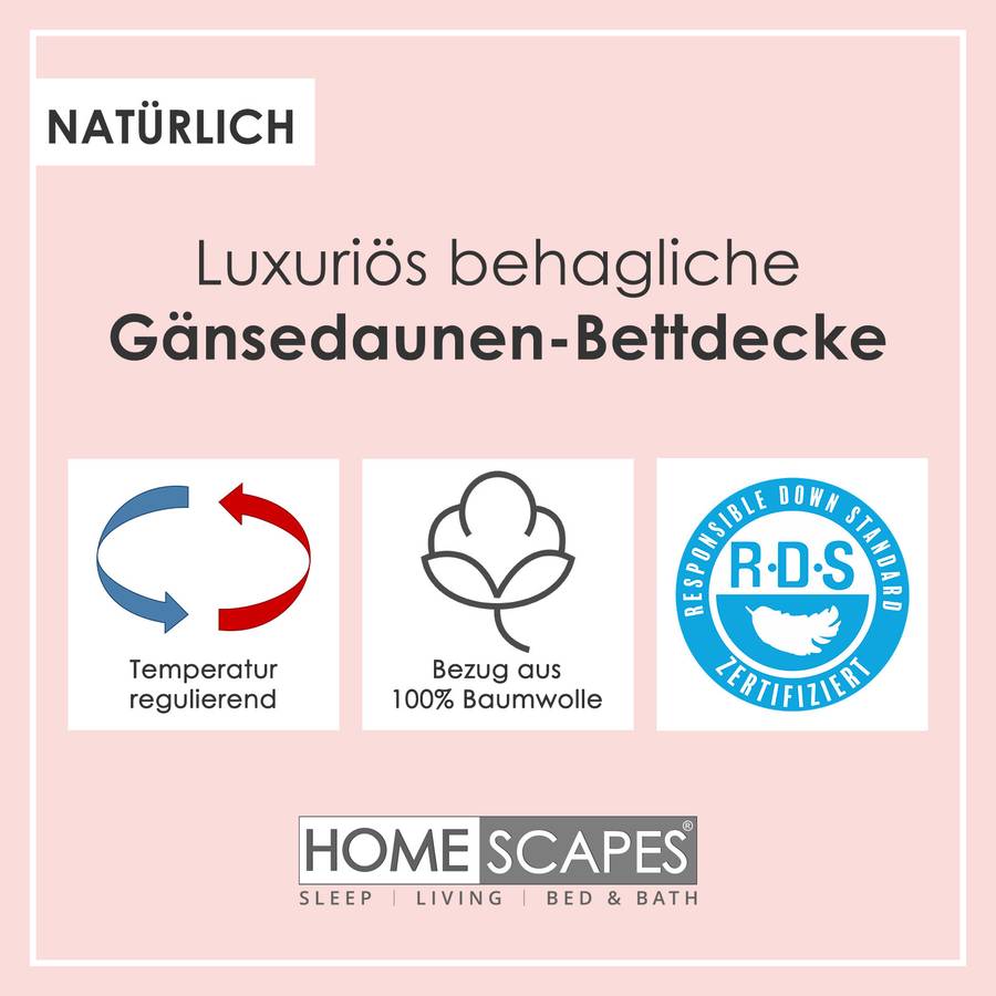 Высококачественное стеганое одеяло от Homescapes гарантирует спокойный сон и непревзойденный комфорт. Одеяло наполнено тщательно обработанным гусиным пухом (не менее 70%) и поддерживающими перьями. Натуральный наполнитель делает это уютное одеяло дышащим, легким и идеально подходящим для теплых летних месяцев. Homescapes использует только перья и пух, полученные не путем ощипывания при жизни, и не идет на компромиссы в вопросах качества и гигиены. Перья и пух проходят специальную паровую очистку и гигиеническую обработку. Подкладка изготовлена в соответствии со стандартом Oeko-Tex Standard 100 и соткана из 100% чистого хлопка повышенной плотности, что предотвращает выпадение наполнителя и размножение клещей. Благодаря этому перьевые и пуховые одеяла Homescapes подходят для людей с аллергией на пыль. Хлопковый чехол обеспечивает терморегуляцию и воздухопроницаемость одеял. Одеяло изготовлено методом блочного шитья с вшитыми внутренними перегородками и отдельными карманами, что обеспечивает равномерное распределение наполнителя и тепла. С помощью кнопок одеяло можно соединить с другим одеялом из той же серии (продается отдельно в Homescapes), чтобы создать универсальное одеяло. Одеяло имеет 10-летнюю гарантию производителя.