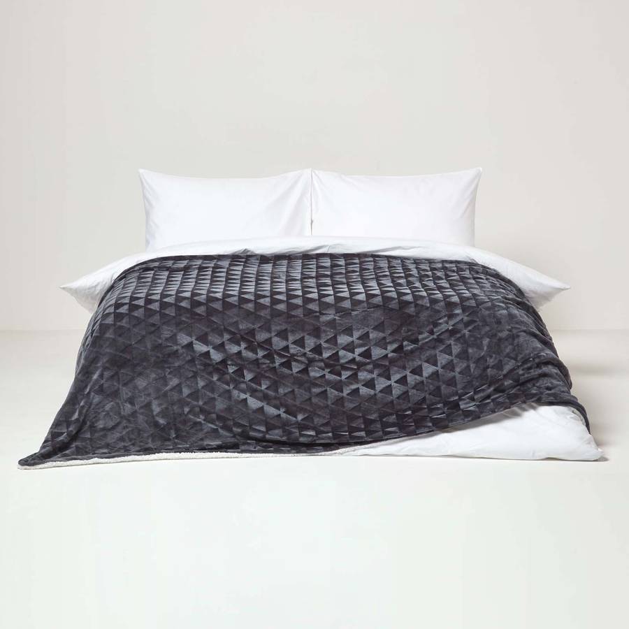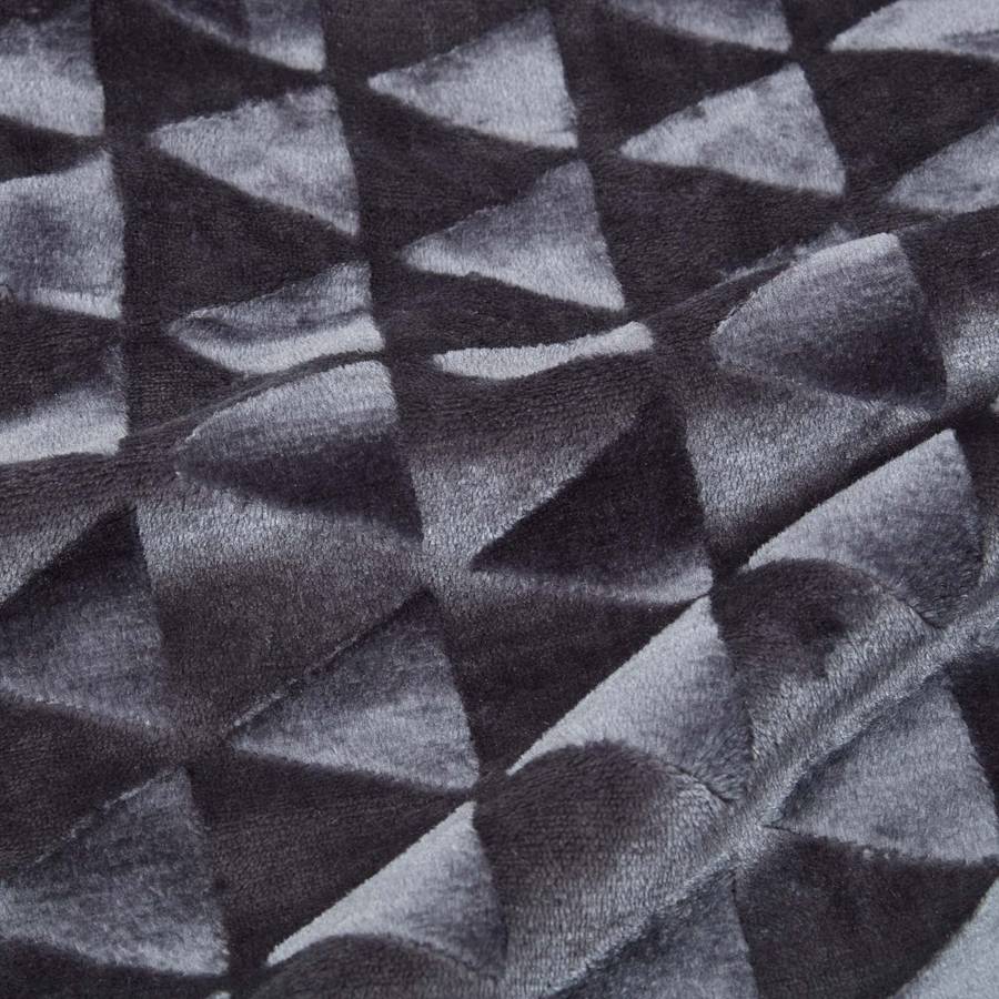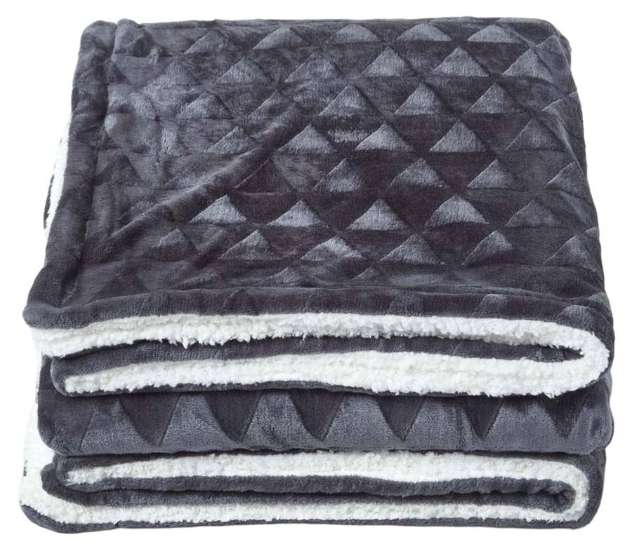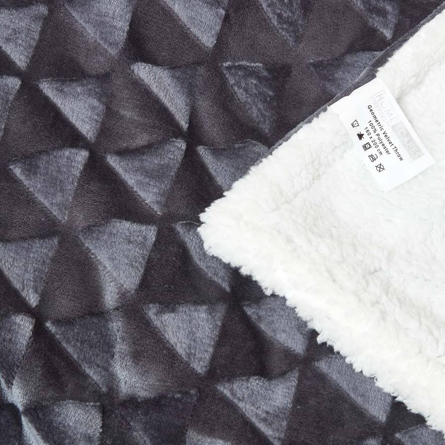 Уютное и мягкое бархатное одеяло с модным треугольным узором в темно-серых тонах и изнаночной стороной из уютного, теплого, кремово-белого флиса Sherpa. Уютное, мягкое одеяло размером примерно 160 x 200 см.