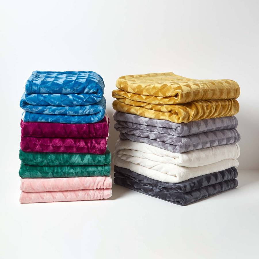 Покрывало с геометрическим рисунком и наполнителем из шерпы доступно во многих выразительных цветах, а также в размерах 130 x 160 см и 200 x 230 см.