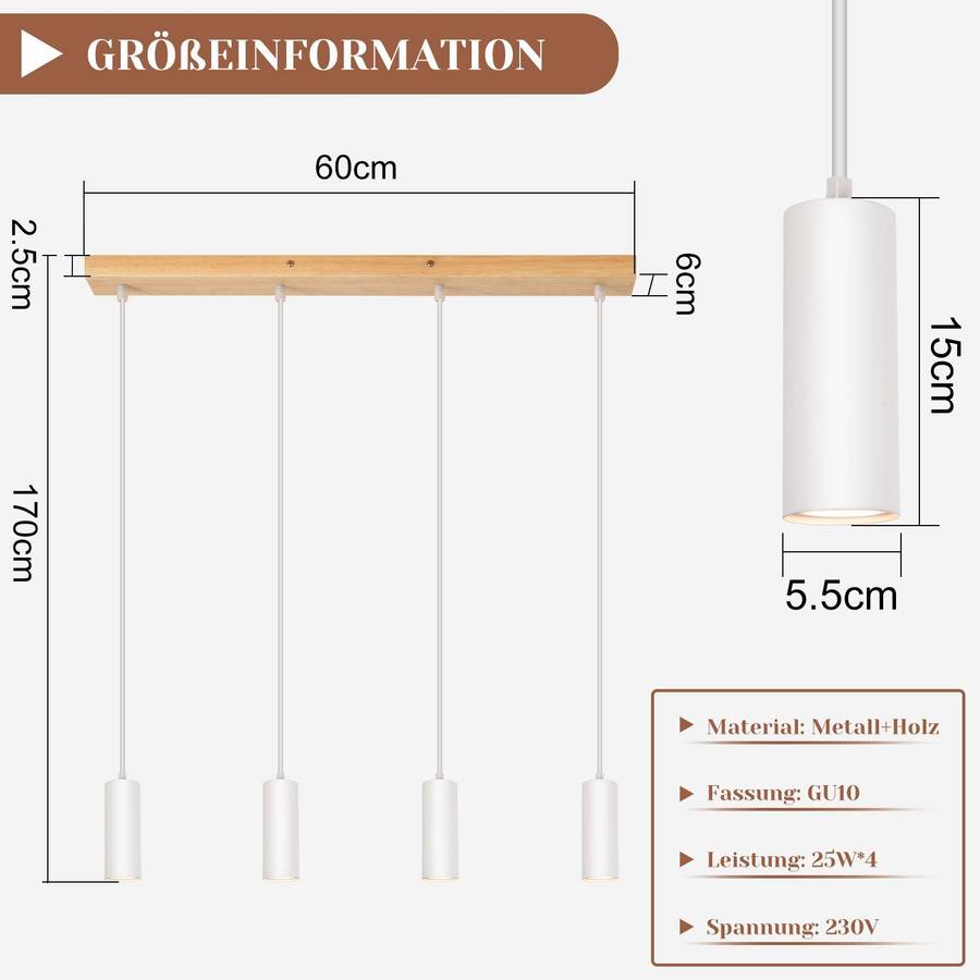 Регулируемая длина: Этот деревянный подвесной светильник можно отрегулировать до максимум 150 см. Подвесной светильник с 4 лампами идеально впишется в вашу комнату. Вы можете отрегулировать его до нужной вам длины. Обратите внимание: из-за ограниченного пространства на потолке люстры, вам придется укоротить шнур питания, если вам нужно отрегулировать его. Обратите внимание, что длину шнура питания можно отрегулировать в соответствии с длиной люстры.