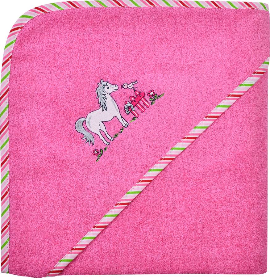 Махровое банное полотенце с капюшоном Wörner Лошадь. Это милое банное полотенце с капюшоном приглашает маленьких купальщиков закутаться в него после купания, на пляже или в бассейне. Оно приятно мягкое, хорошо впитывает влагу и прочное. С красивой вышивкой и отделкой лентами.