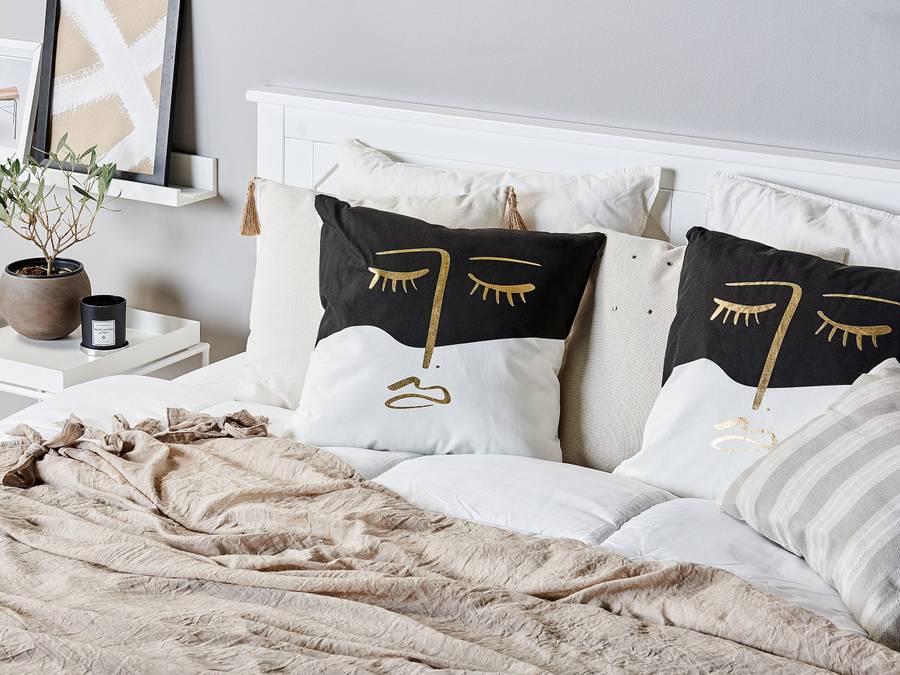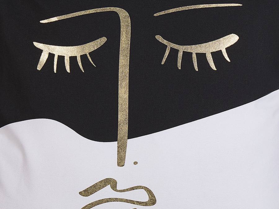 Комплект из двух современных декоративных подушек с модным рисунком лица. Ищете декоративную, но уютную подушку, которая подарит вам чудесные сны и полное расслабление? С этим необычным аксессуаром крепкий сон вам гарантирован. Классическая черно-белая цветовая гамма приобретает блестящий и гламурный оттенок благодаря золотым украшениям, что подходит всем современным стилям интерьера.