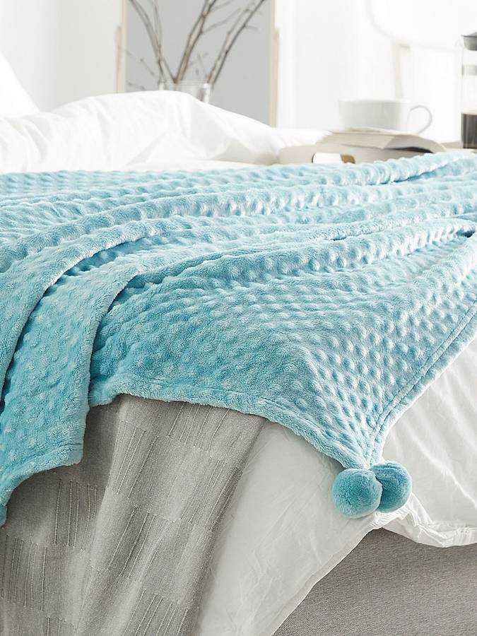 Мягкое, теплое одеяло для множества уютных моментов. Теплое, уютное одеяло светло-голубого цвета из тончайшего материала для уютных моментов на диване или на террасе. У него красивые помпоны, он декоративный и универсальный.